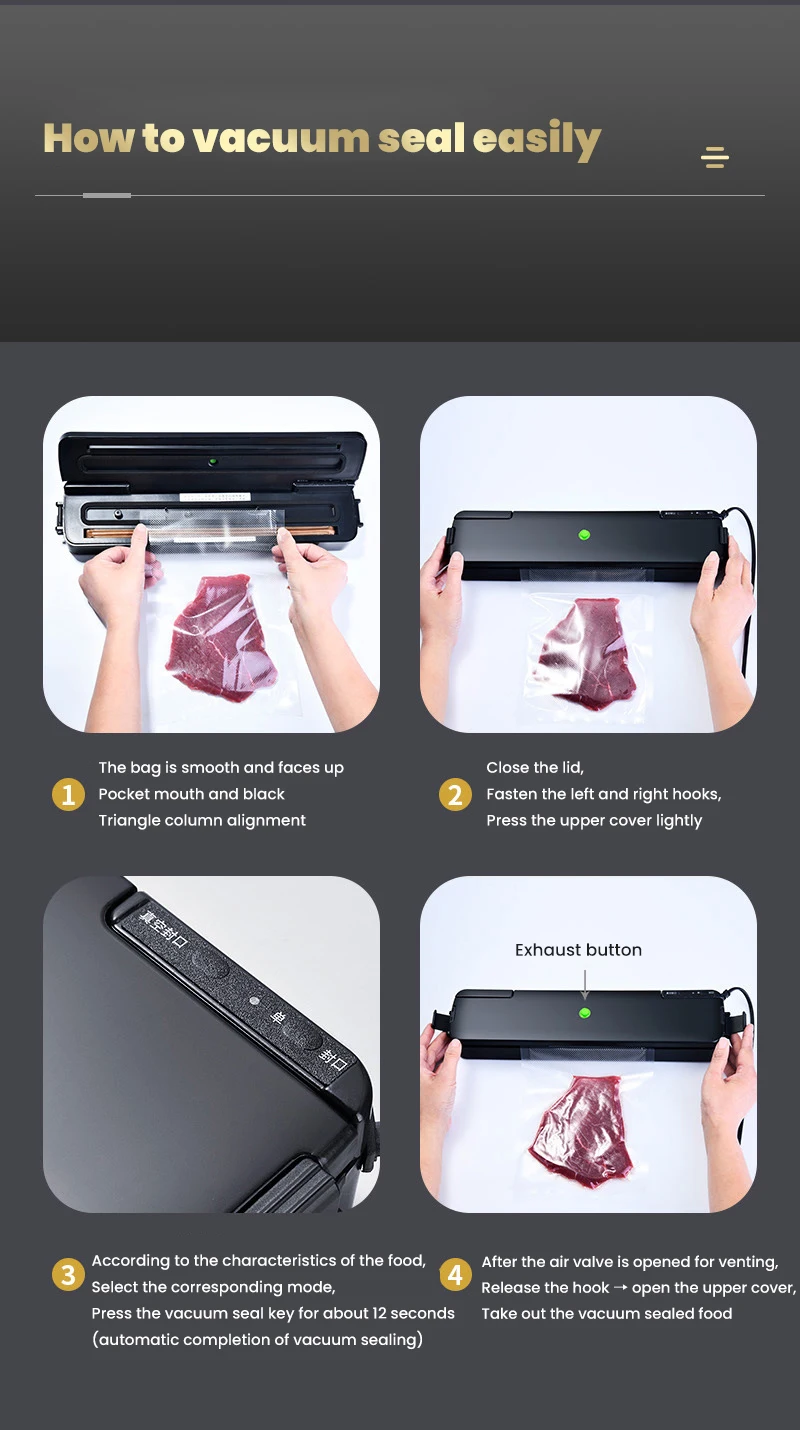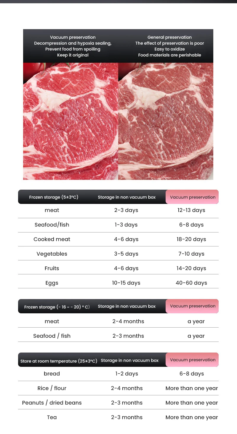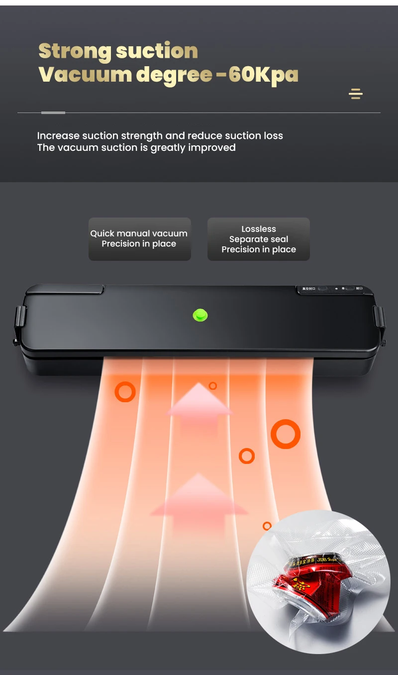 Характеристики продукта: сильное всасывание, общее использование для влажных и сухих, функция Внешней откачки, неразрушающее уплотнение, компактное и простое хранение, длительная свежесть