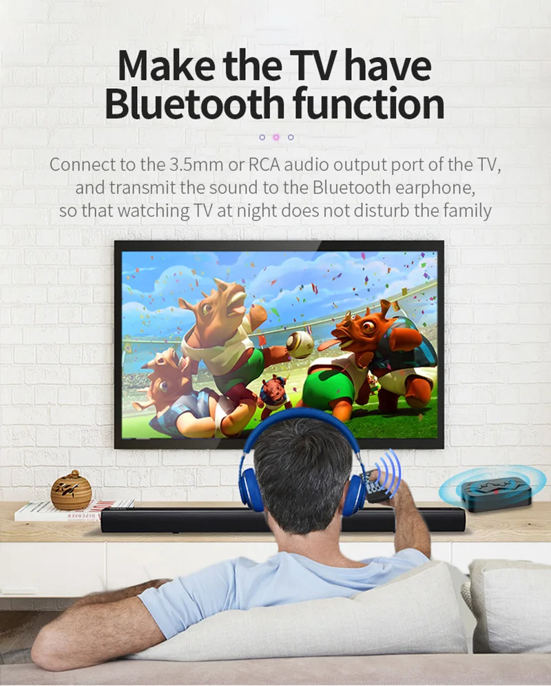 Подключитесь к 3,5 мм или RCA аудио выходной порт ТВ и передавать звук на Bluetooth наушники, таким образом, чтобы смотреть ТВ в ночное время не беспокоить семейный