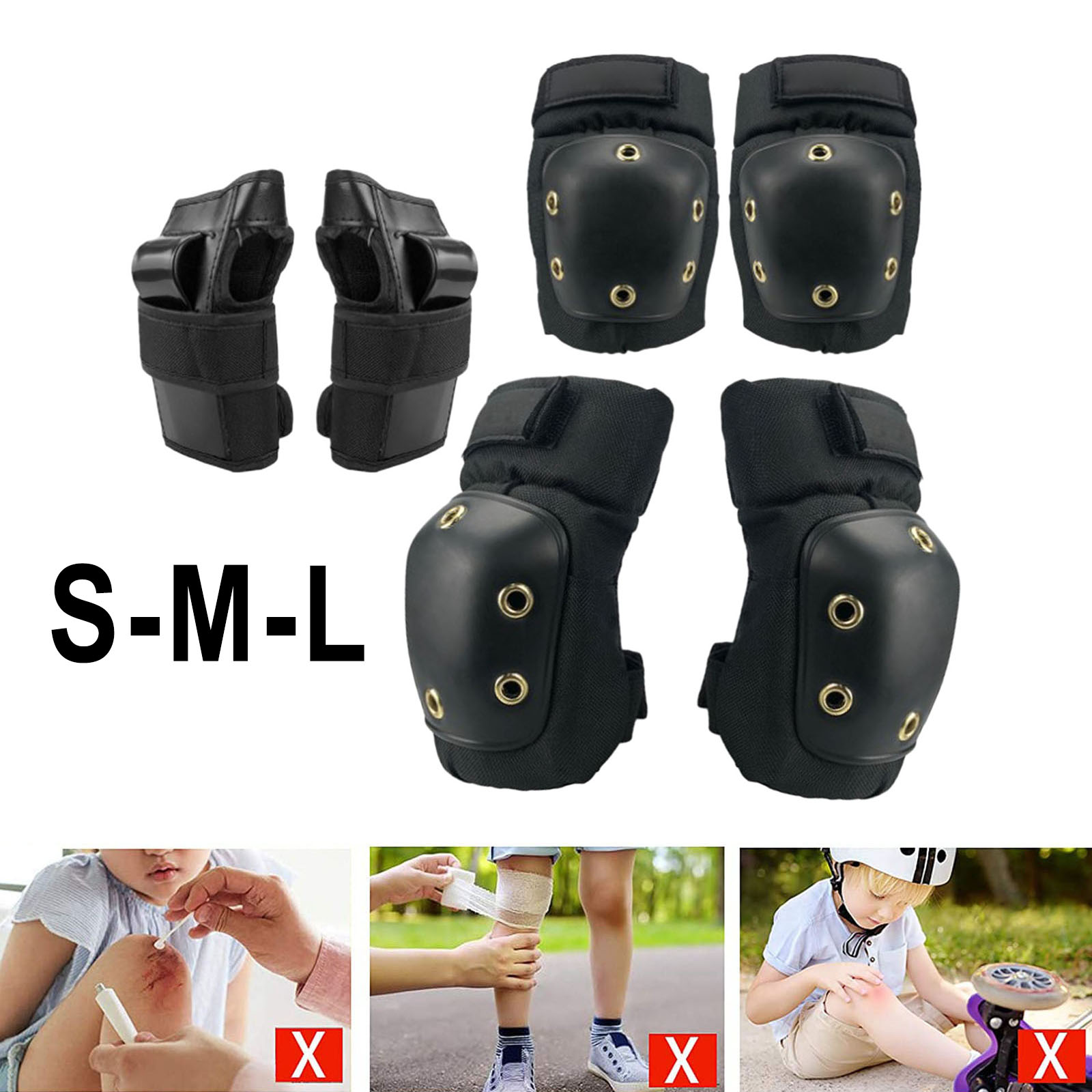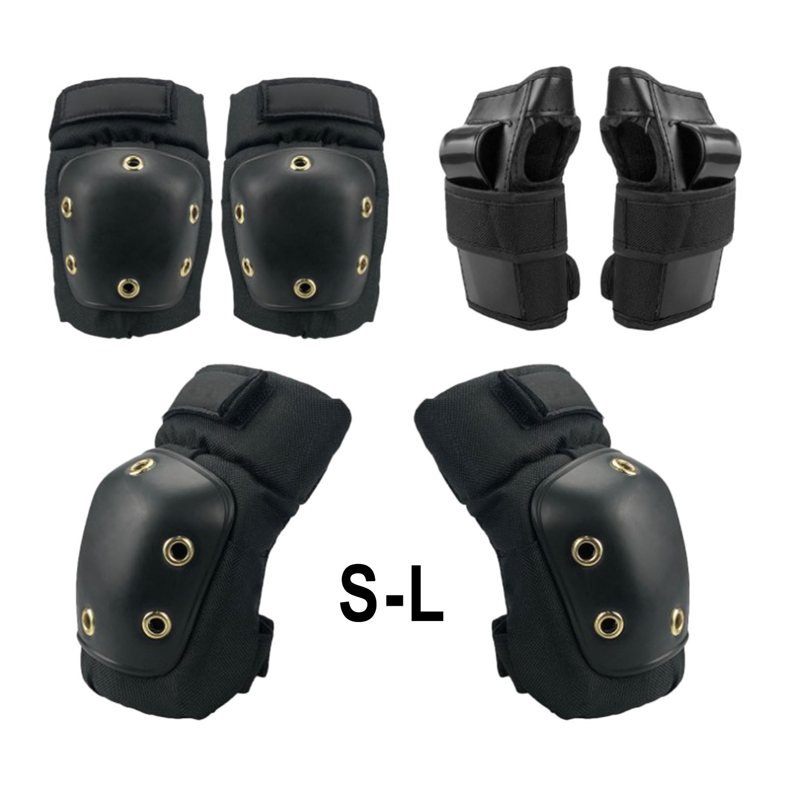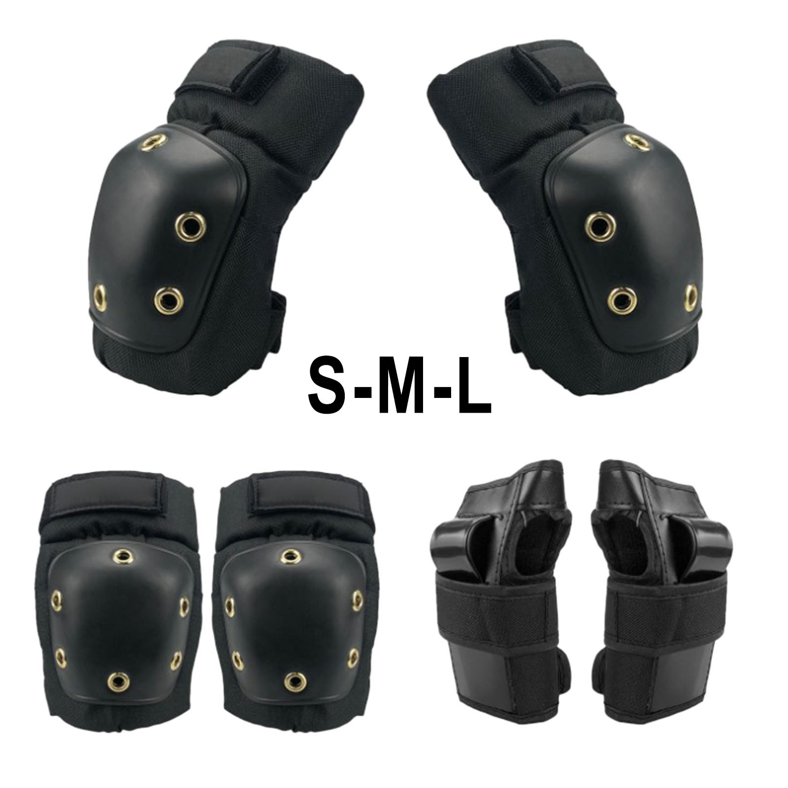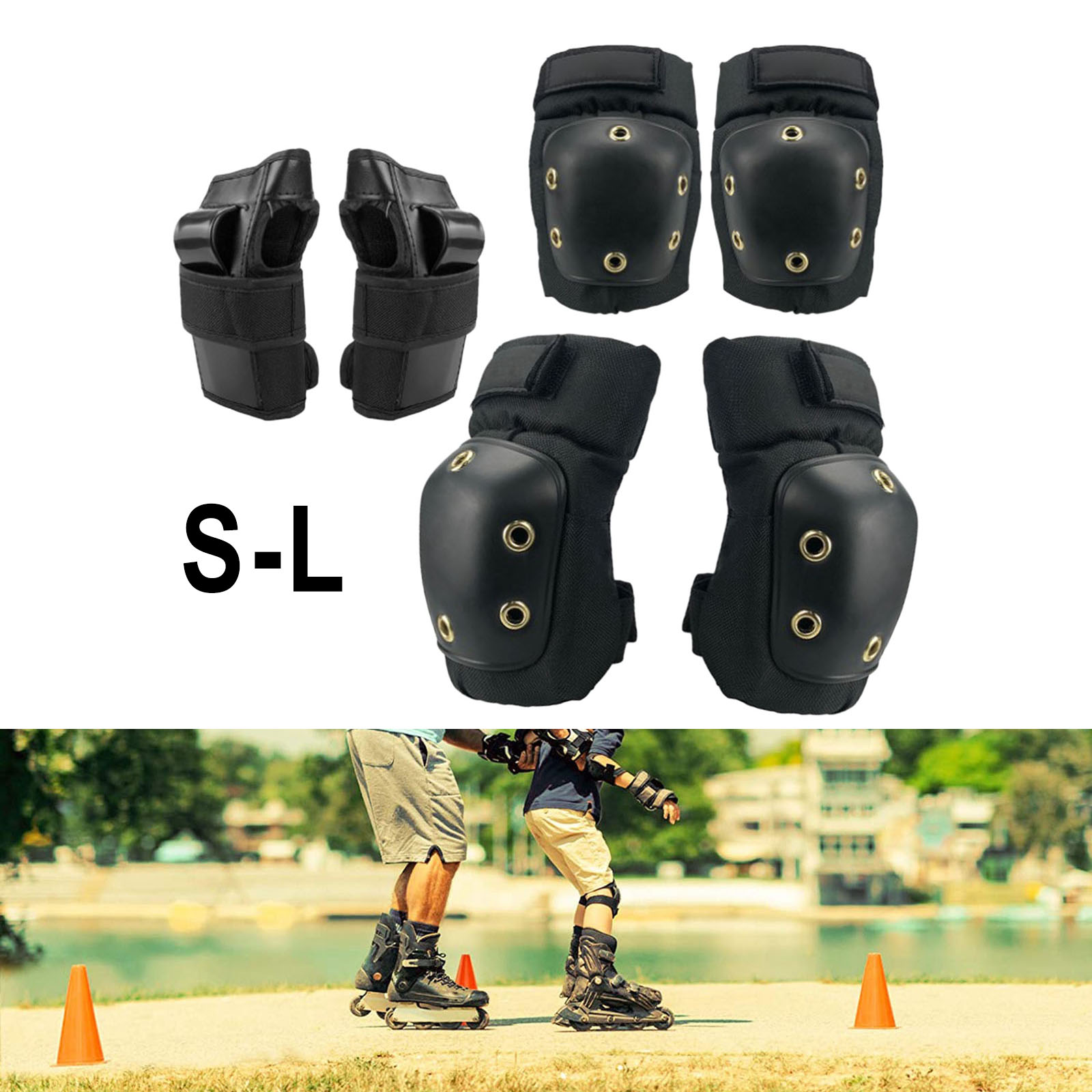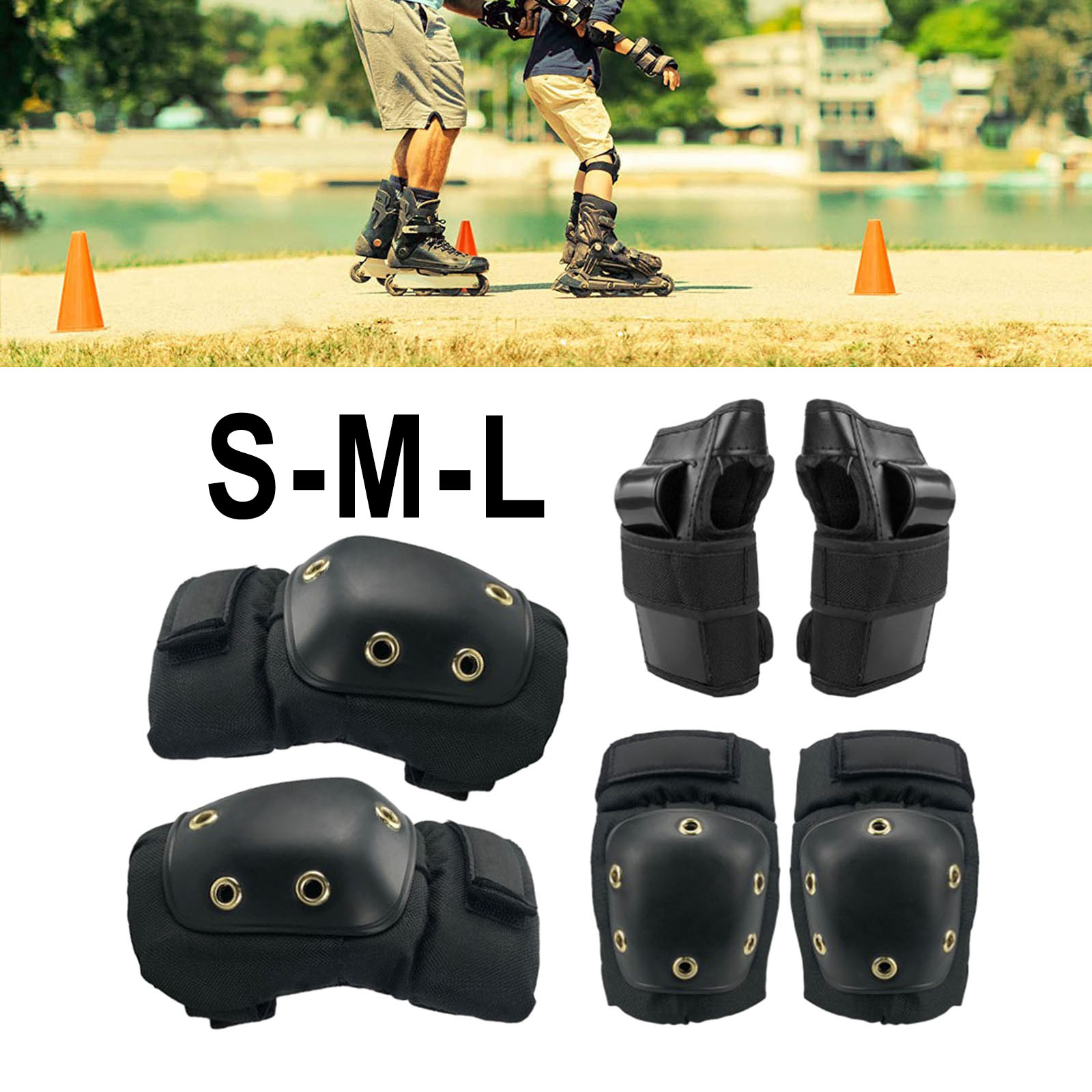 Удобный защитный набор включает в себя по одной паре наколенников, налокотников и наручных щитков для катания на коньках, велосипедах и роликовых коньках, скейтборде.