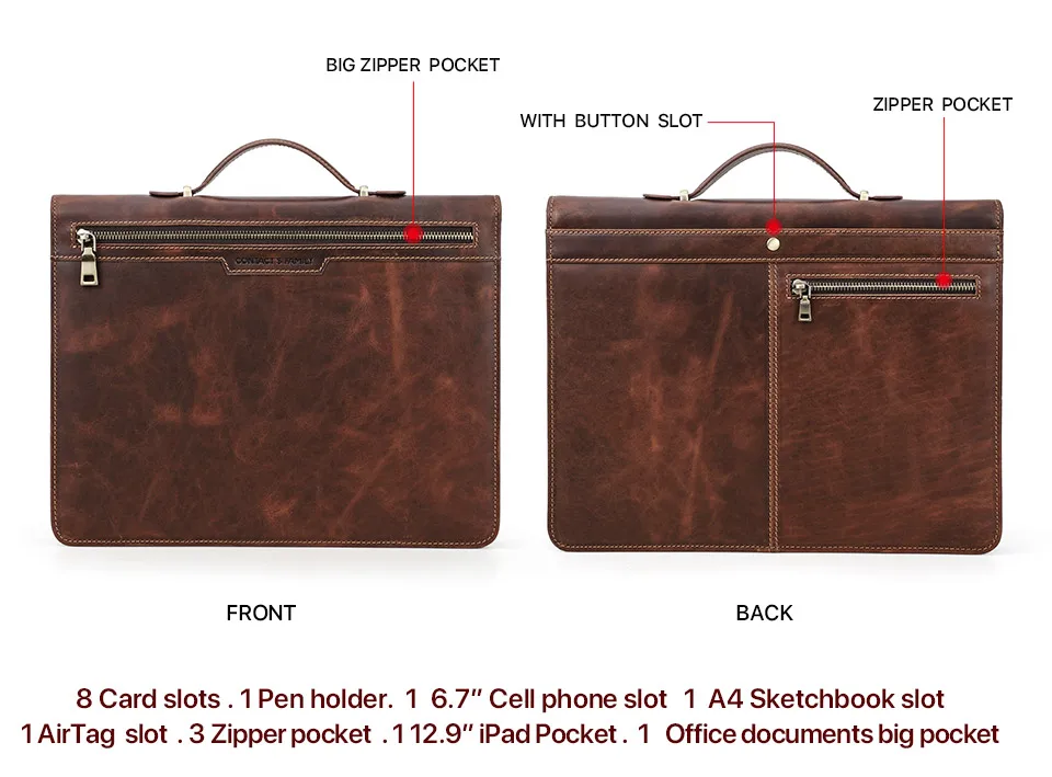 [Хранение] левая часть имеет различные внутренние карманы и слоты, которые могут хранить документы, мобильные телефоны, airtag, наушники, кабели, карты, ручки и т. Д., что удобно для ежедневного использования и деловых поездок. Центральная часть для блокнотов для рукописного ввода формата А4. Быстрый доступ во внешнем кармане на молнии.