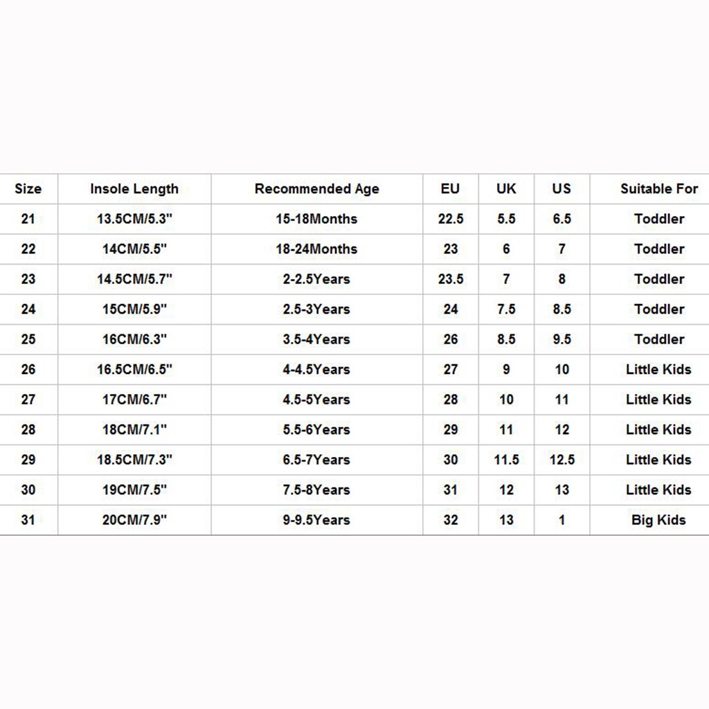 Size Insole Length Recommended Age EU UK US Suitable For 21 13.5CM/5.3" 15-18Months 22.5 5.5 6.5 Toddler 22 14CM/5.5" 18-24Months 23 6 7 Toddler 23 14.5CM/5.7" 2-2.5Years 23.5 7 8 Toddler 24 15CM/5.9" 2.5-3Years 24 7.5 8.5 Toddler 25 16CM/6.3" 3.5-4Years 26 8.5 9.5 Toddler 26 16.5CM/6.5" 4-4.5Years 27 9 10 Little Kids 27 17CM/6.7" 4.5-5Years 28 10 11 Little Kids 28 18CM/7.1" 5.5-6Years 29 11 12 Little Kids 29 18.5CM/7.3" 6.5-7Years 30 11.5 12.5 Little Kids 30 19CM/7.5" 7.5-8Years 31 12 13 Little Kids 31 20CM/7.9" 9-9.5Years 32 13 1 Big Kids