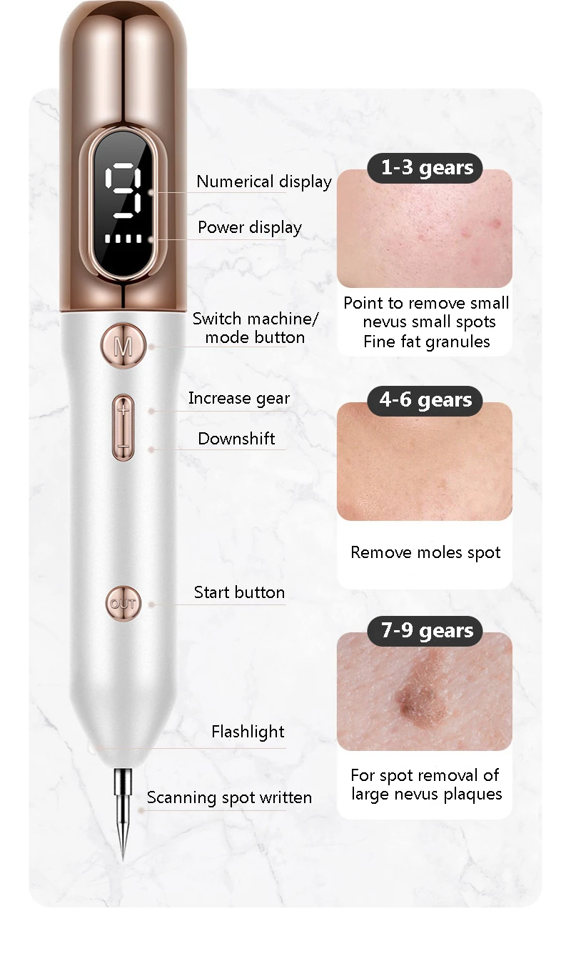 2. Есть 9 интенсивностей, подходит для различных процедур. Низкий класс используется для пятен и веснушек. Сильный класс используется для родинок и тегов кожи.