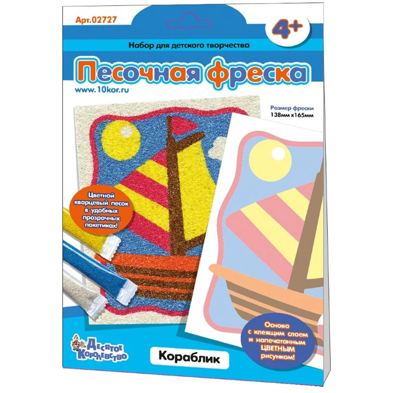 Описание Фреска-картина из песка Десятое королевство "Кораблик"«Кораблик» - набор для детского творчества, который позволит Вашему ребенку от 4-х лет создать яркую и оригинальную картину.
