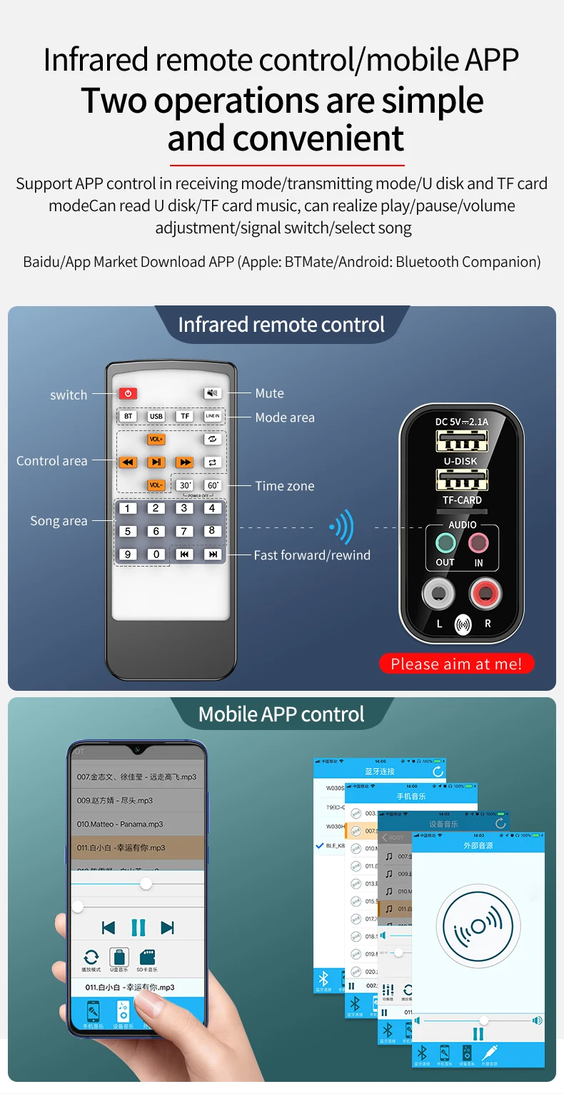 5. Поддержка инфракрасного дистанционного управления, включение/выключение/воспроизведение/пауза/вверх/вниз/громкость/вычитание/переключатель источника звука;