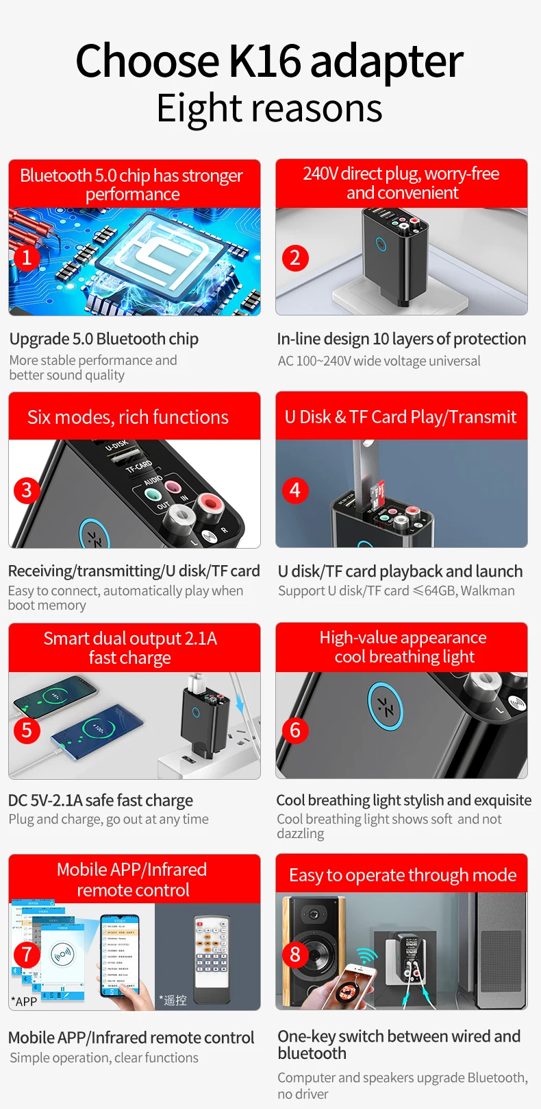 8. Aux + RAC двойной интерфейс выхода, можно подключить два динамика и другое оборудование одновременно;