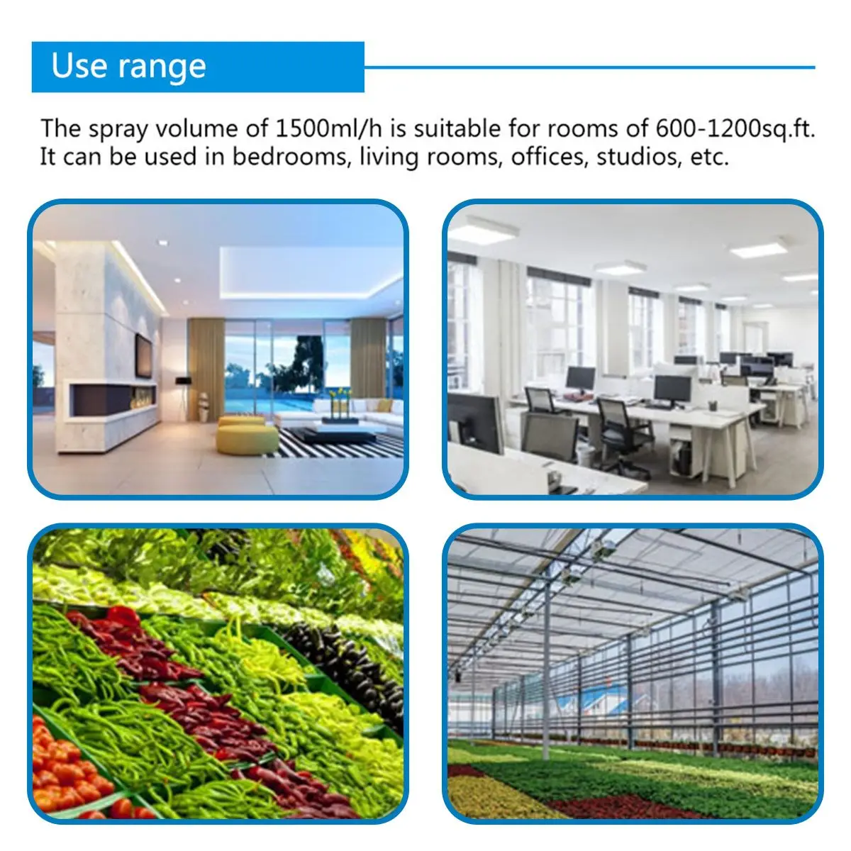 1200 квадратных футов-Точные большие увлажнители работают одновременно, с большим резервуаром для воды 15 л, который может достигать объема распыления 1500 мл в час, так что площадь 600-1200кв футов остается влажной.