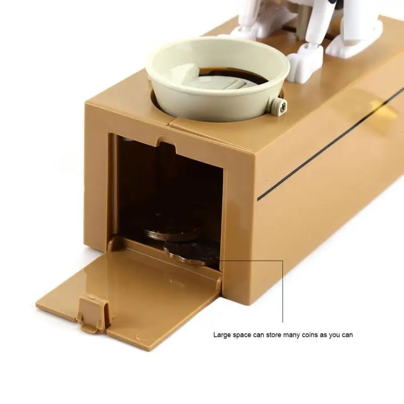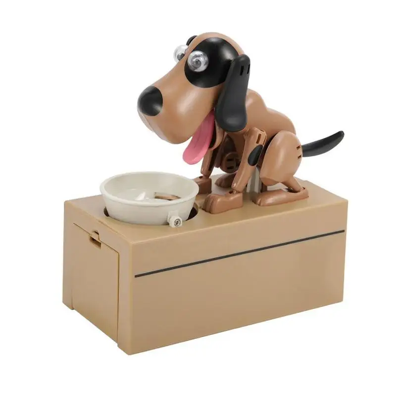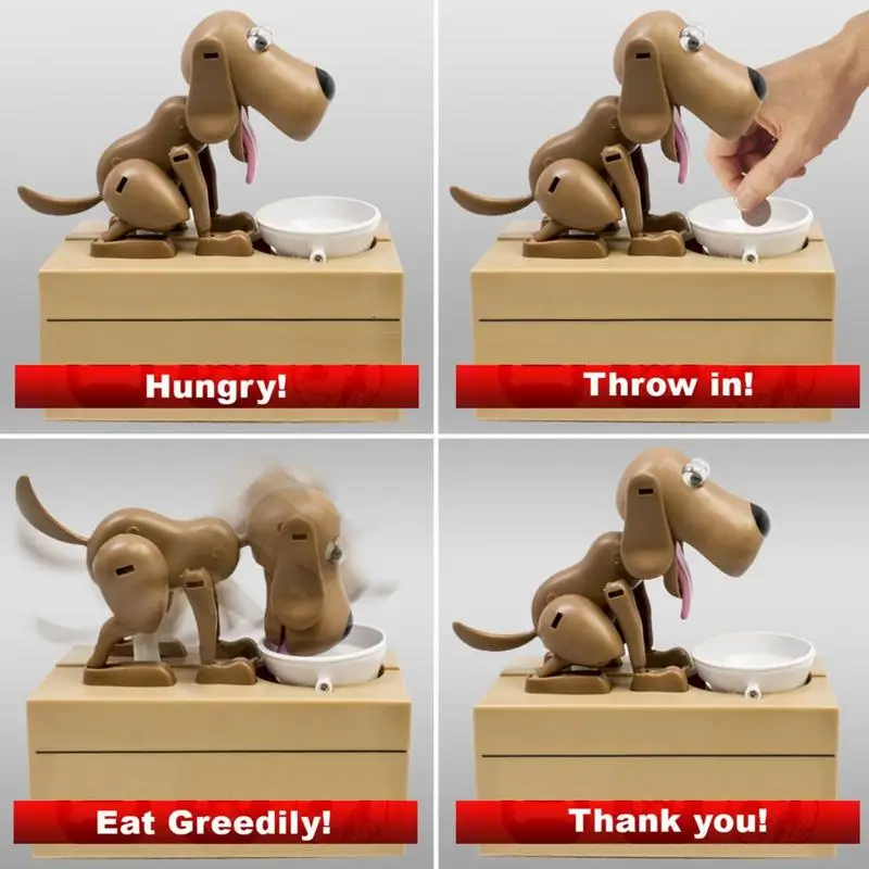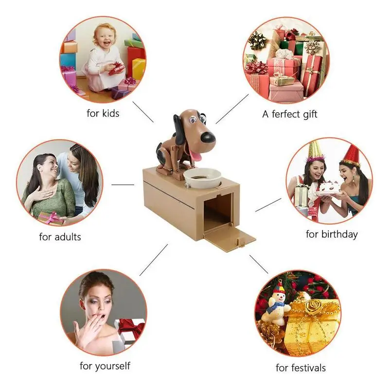 Этот милый щенок с радостью сохранит вашу монету в своей подарочной коробке. Поместите монету на лоток и посмотрите, как она жует счастливо. Он собирает монету, которую вы ему дали, и хранит ее в своей подарочной коробке. Это голодная собака с только деньгами, только потребляет монеты! Вы будете знать, что когда он начнет трясти головой, он будет очень счастлив и будет наклоняться вверх и вниз, как он потребляет монеты. Ваша цель-сделать эту собаку максимально полной, что означает, что вы должны начать экономить все изменения. Какой забавный и безопасный способ сэкономить!