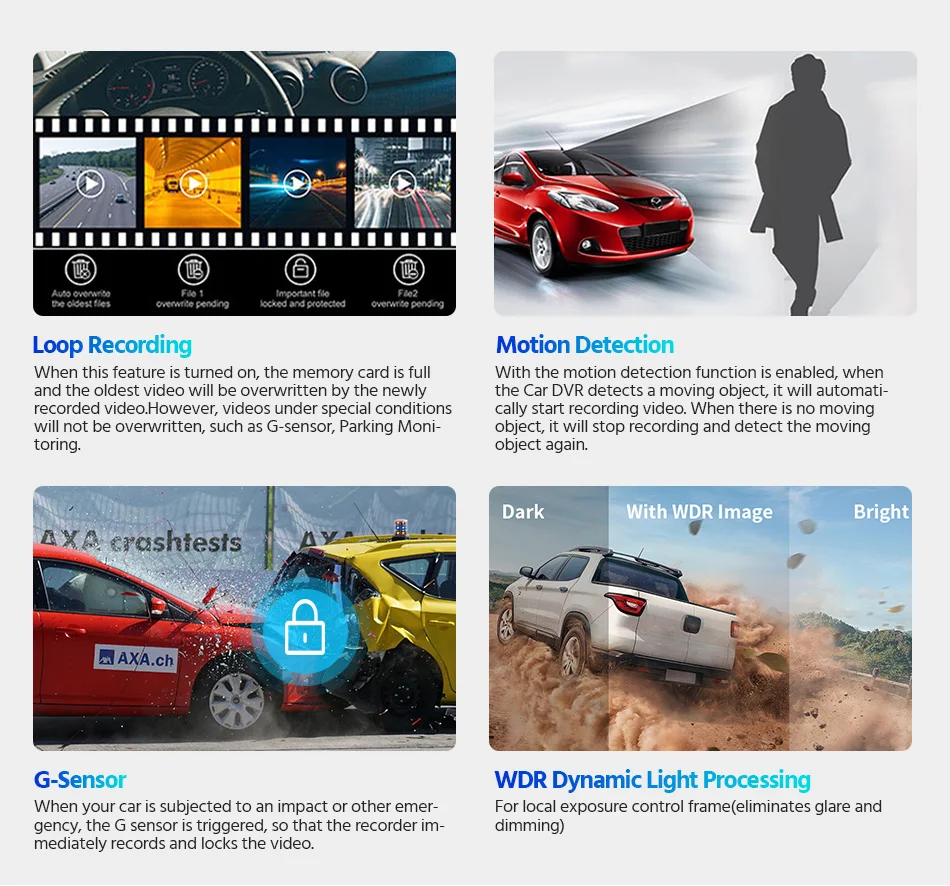 E-ACE Dash камера B44 может записывать видео с разрешением до 2160p (Ultra-HD). Ультра широкий угол обзора объектива A + на 170 ° обеспечивает более широкий угол обзора, чтобы запечатлеть эти важные детали. Функция WDR оптимизирует качество видео с более широким диапазоном освещения и деталями изображения.