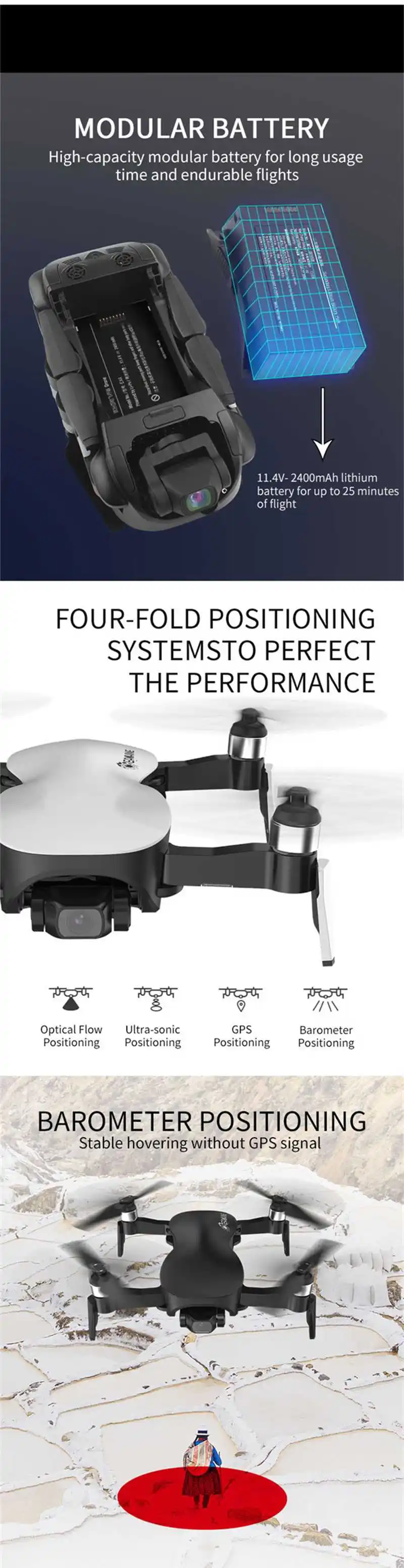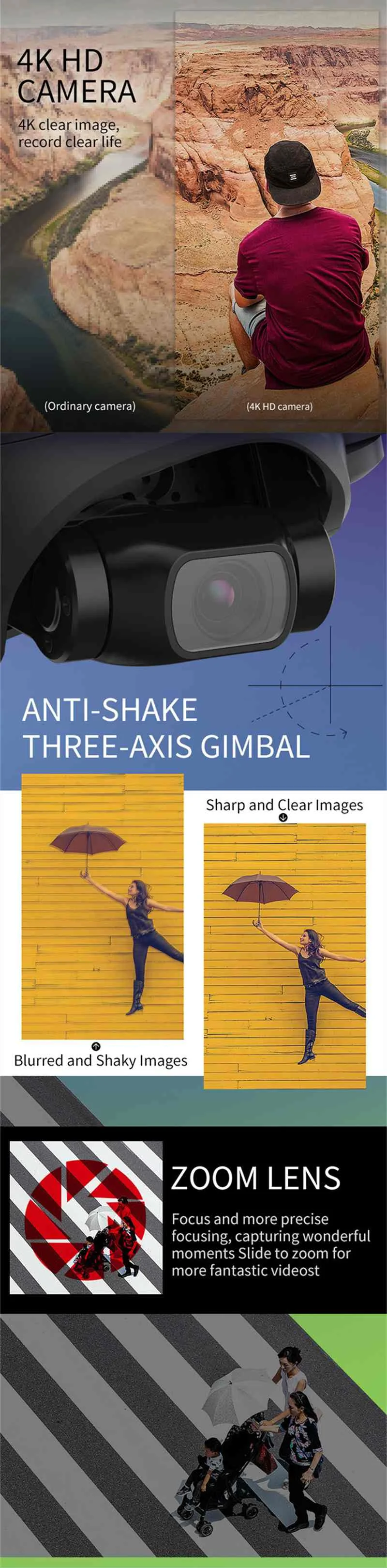 5)Карданный шарнир камеры 4K HD. Он оснащен камерой 4K, настроенной удивительно для съемки фотографий и видео с неба, также сТри-бесщеточный карданный шарнир, Помогает бесвибрационным ногам дрона.