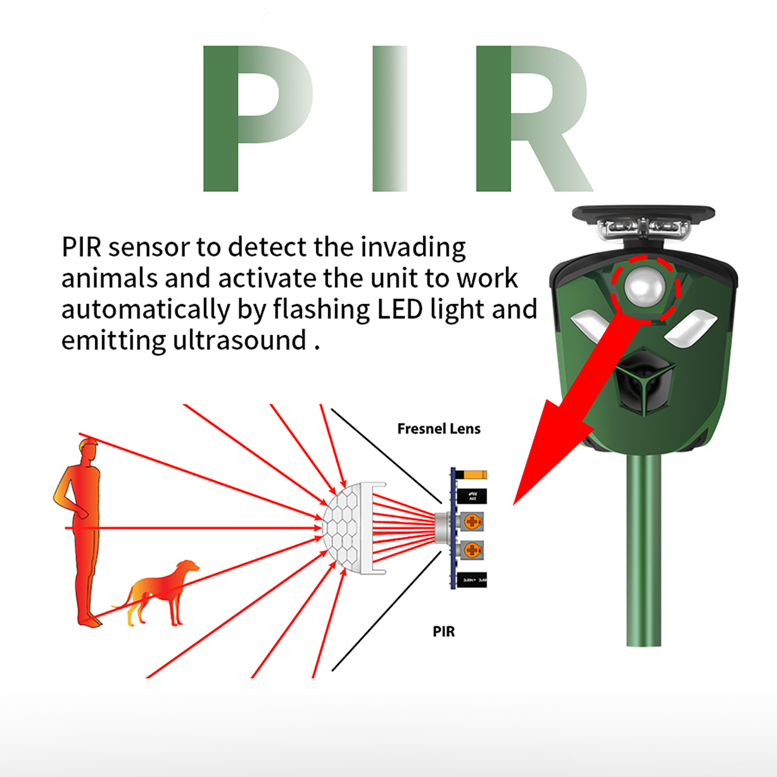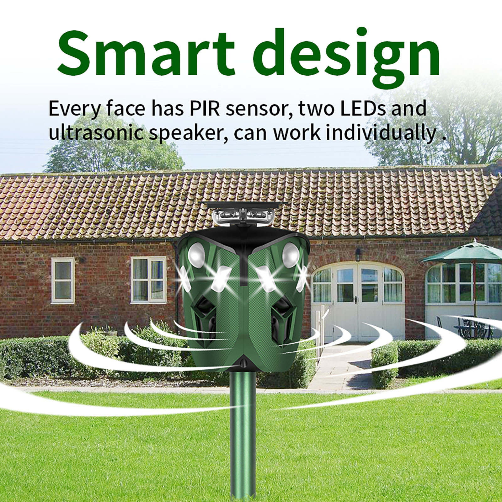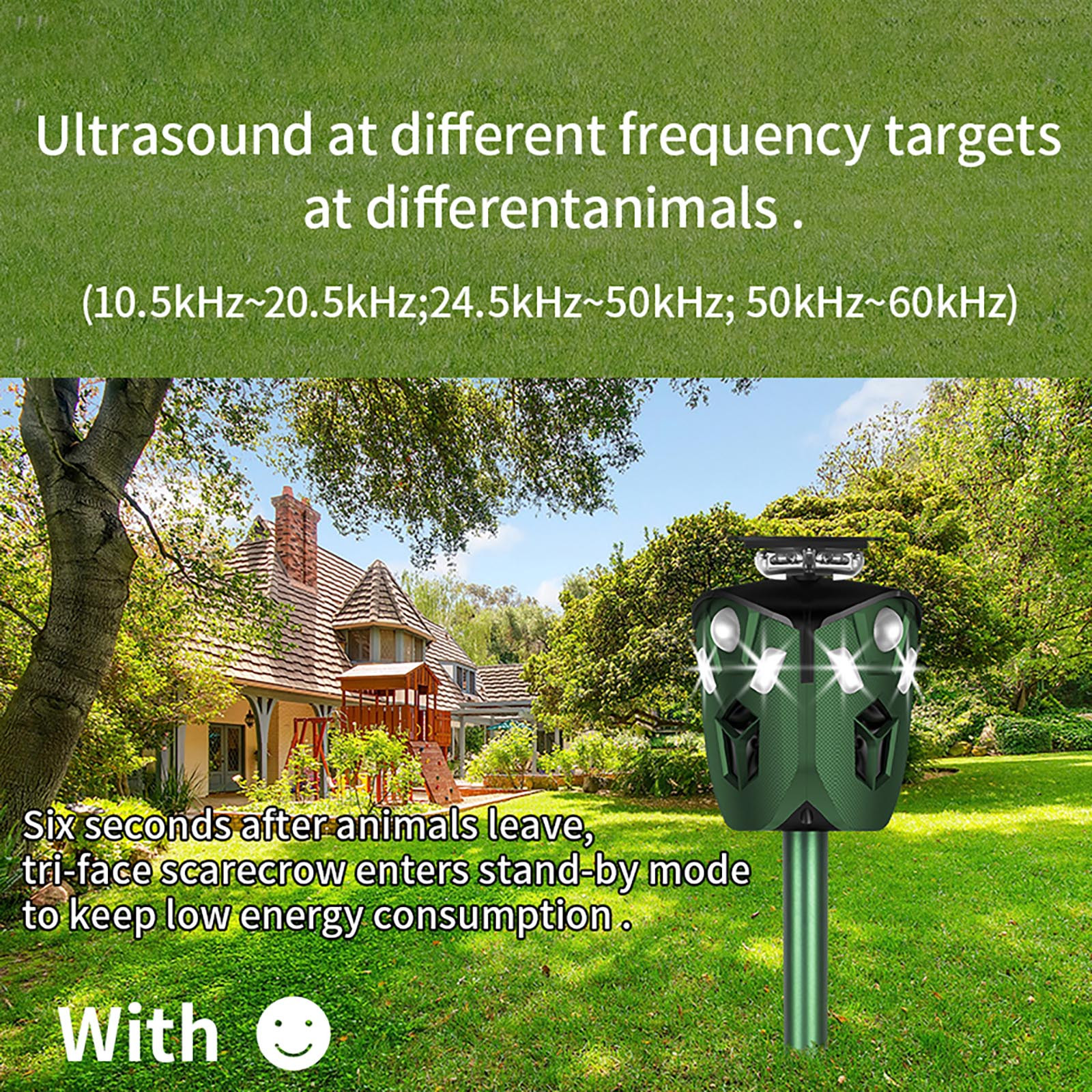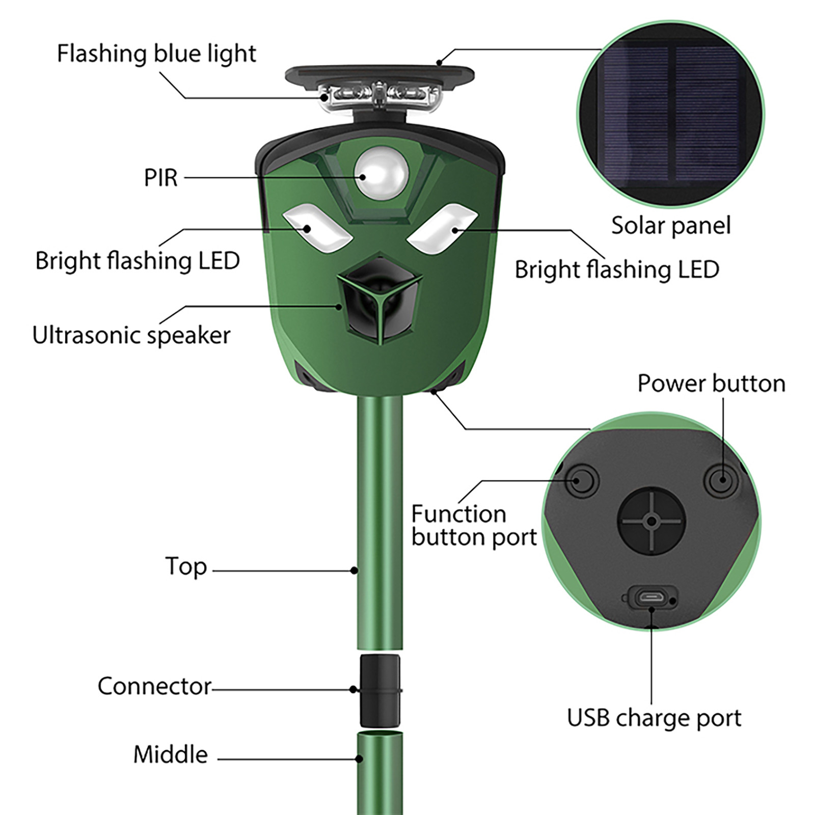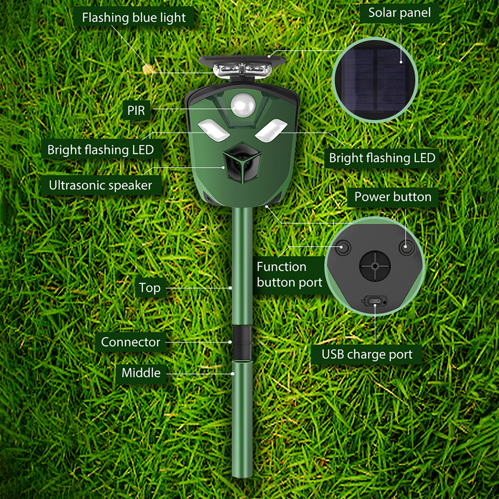 360 градусов Эффективный отпугиватель животных: В отличие от традиционных отпугивателей, Phosooy solar ANIMAL Репеллент состоит из 3 Сторон, каждая сторона имеет инфракрасный датчик, таким образом, он может Почувствуйте животных со всех сторон. Когда животное приближается, все Три стороны будут мигать светодиодами, издавать ультразвуковые звуки и резкий звук Чтобы отпугнуть собак, диких кошек, оленей, енота и других животных. Это Не работает с домашними кошками, белками или лисами. Звуковой/ультразвуковой режим: когда движение ПИР животного и запускается, белый Сисветильник свет (и днем или ночью без солнца, синий светильник также) мигает, Звуковой сигнал излучает ультразвуковые волны с частотой 15 кГц ~ 50 кГц и вызывает тревогу Звуки. Если звук вас беспокоит, вы можете отключить тревожный звук Вскоре нажмите кнопку звука, а затем погаснет зеленый индикатор. 2 способа для Источник питания: ультразвуковой отпугиватель животных Phosooy оснащен солнечной батареей Панель в качестве источника питания, а также поддерживает зарядку через USB Кабель, так что он стоит низко и не загрязняет окружающую среду. Перед первым использованием, Пожалуйста, зарядите устройство под солнечным светом в течение 12 часов или с помощью USB Кабель на 6 часов. Безвредный и Гуманно: ультразвуковые волны не слышны человеком, поэтому только животные будут Под влиянием. Он предназначен для того, чтобы отгонять животных с помощью ультразвуков, вызывая тревогу И сильный свет. Не содержит химикатов и повреждений, что очень гуманно и идеально Для людей, которые беспокоятся о животных, но не хотят причинять им вред. Легко Применение: для установки требуется только простое подключение. Место Phosooy Ультразвуковой отпугиватель животных прямо в правильное положение, где светильник Прикосновения. И когда PIR обнаруживает движение животного и запускает его, Отпугиватель Начинает работать. Он предназначен для работы в любых погодных условиях Защита от дождя, ветра и солнца.Включает: