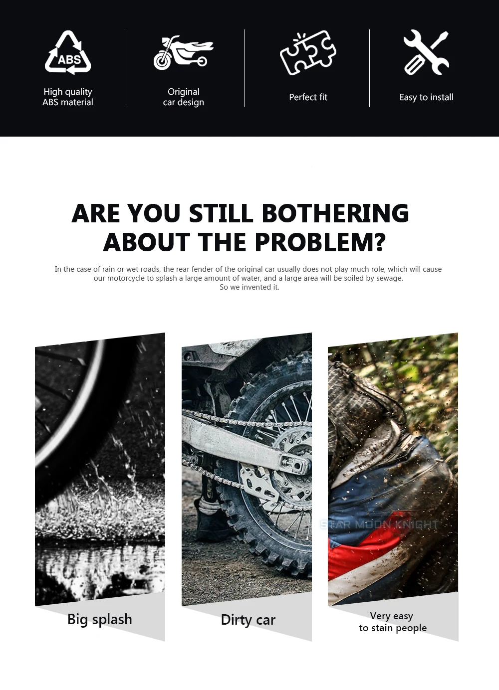 Продлевает длину вашего текущего запаса заднего крыла. Они прикрепляются к вашему велосипеду orginial fender с помощью двусторонней ленты. Это отличное решение старомодной проблемы наличия нежелательных дорожных обломков, летающих к вашему велосипеду. Это обеспечивает защиту вашего двигателя, радиатора, масляного охладителя и кузова от всех видов мусора, который получает от передней шины.