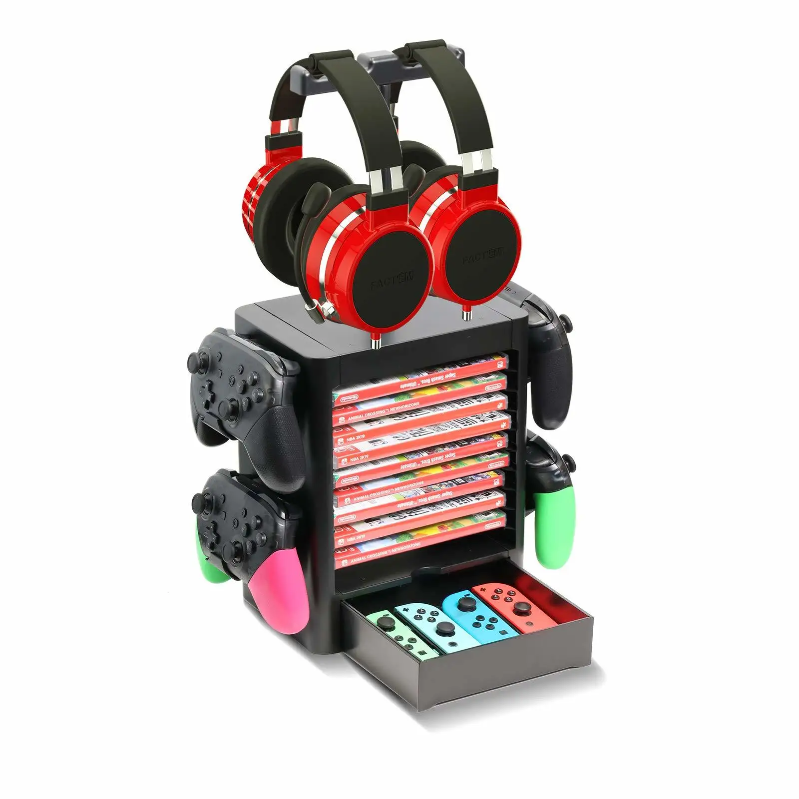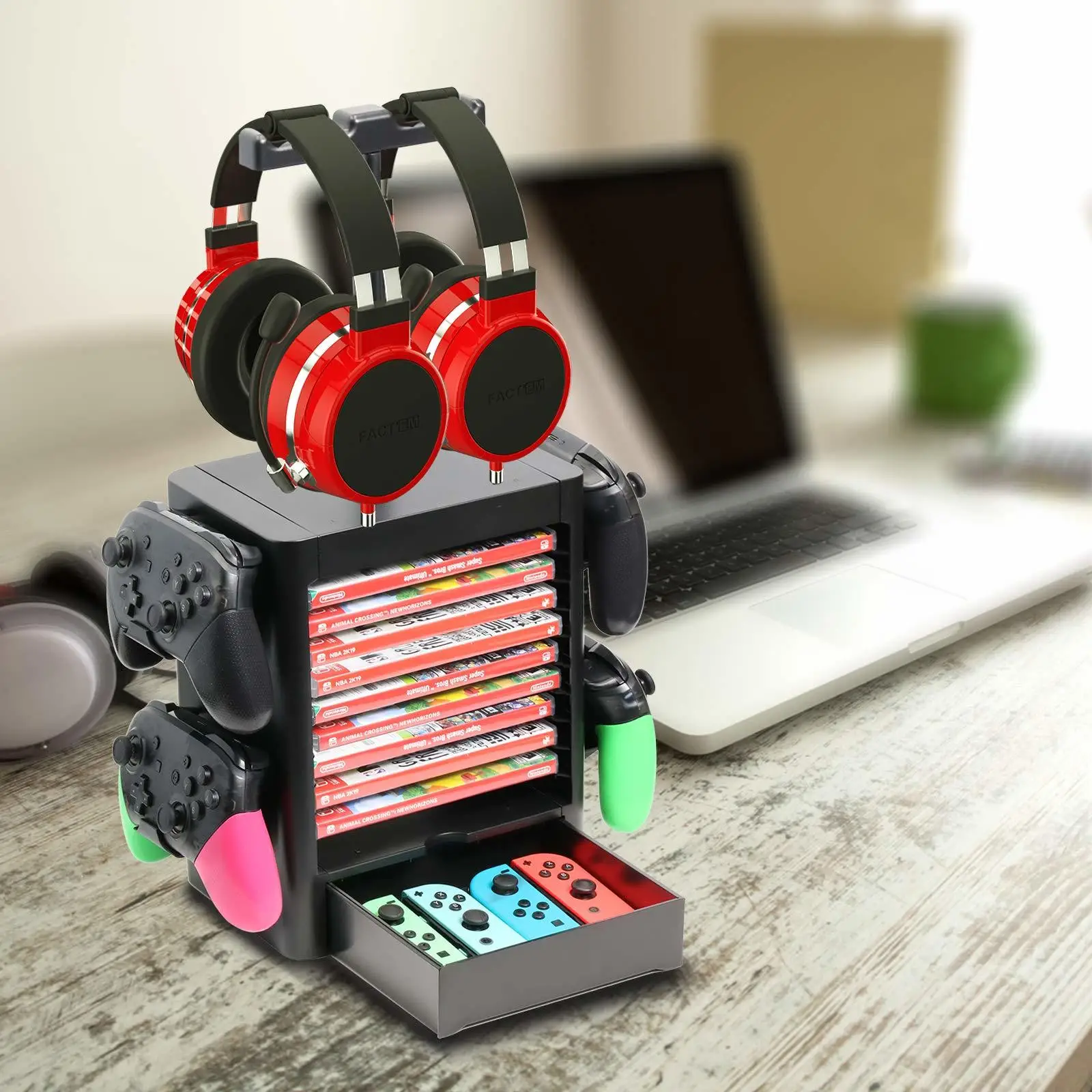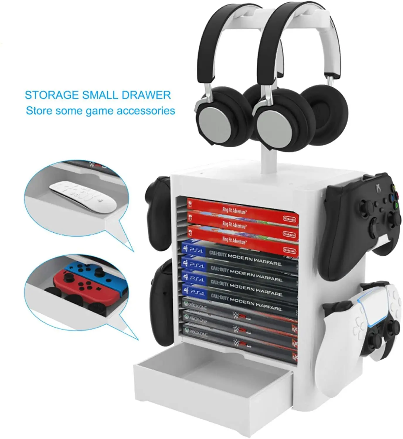 Башня хранения для выключателя-этот органайзер может вмещать 2 гарнитуры, 10 чехлов для игровых карт и повесить 4 pro контроллера. Он имеет небольшой нижний ящик, чтобы положить joy cons или другие аксессуары. Он совместим с различными игровыми консолями, такими как PS5, PS4, Xbox, Nintendo Switch.
