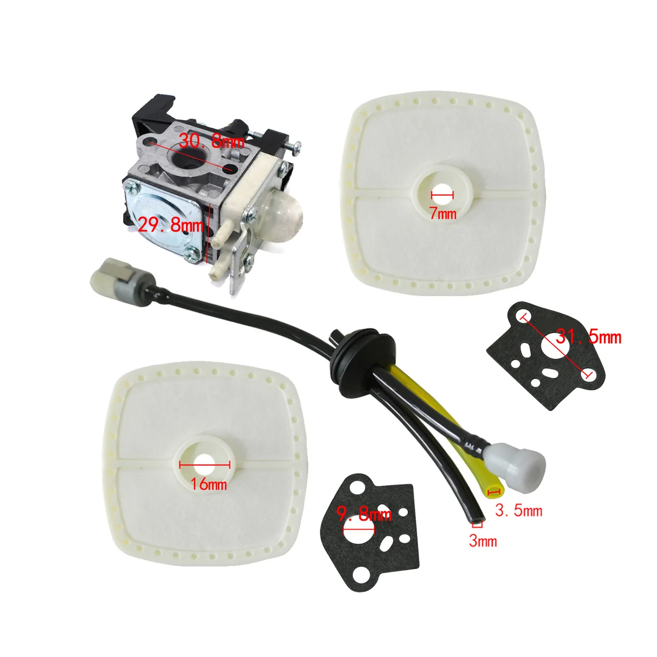 1 * карбюратор, 2X карбюратор прокладки, 1X комплект топливной линии с вентиляционным и топливным фильтром, 2X воздушные фильтры