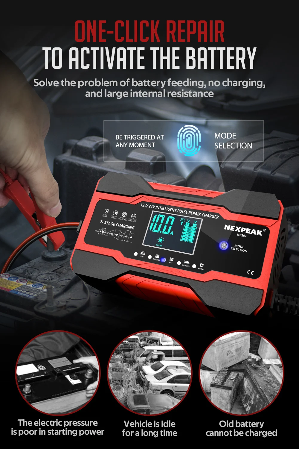 3.【 высокоэффективный импульсный ремонт 】автоматически обнаруживает сульфатирование батареи и кислотное расслоение, принимает новейшую функцию ремонта пульса, чтобы восстановить потерю производительности батареи для более сильного запуска двигателя и продления срока службы батареи. Примечание: нельзя активировать или заряжать полностью мертвые батареи.