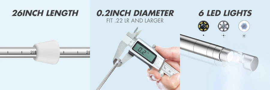 0,2-дюймовый диаметр зонд позволяет легко вступления в винтовка бочки, как малые. 20 калибра. 26 дюймов-длинный стержень больше, чем у большинства винтовок, поэтому вам не нужно переключать из бочка для намордник для того, чтобы полностью проверить отверстия. Для определения местоположения камеры в стволе имеется измерительная шкала на стержне из сплава.