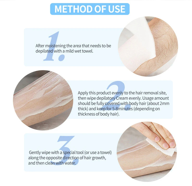 2. Нанесите этот продукт равномерно на место удаления волос, затем равномерно протрите крем для депиляции. Количество использования должно быть полностью покрыто волосами (толщиной около 2 мм) и храниться в течение 5-8 минут (в зависимости от толщины волос).