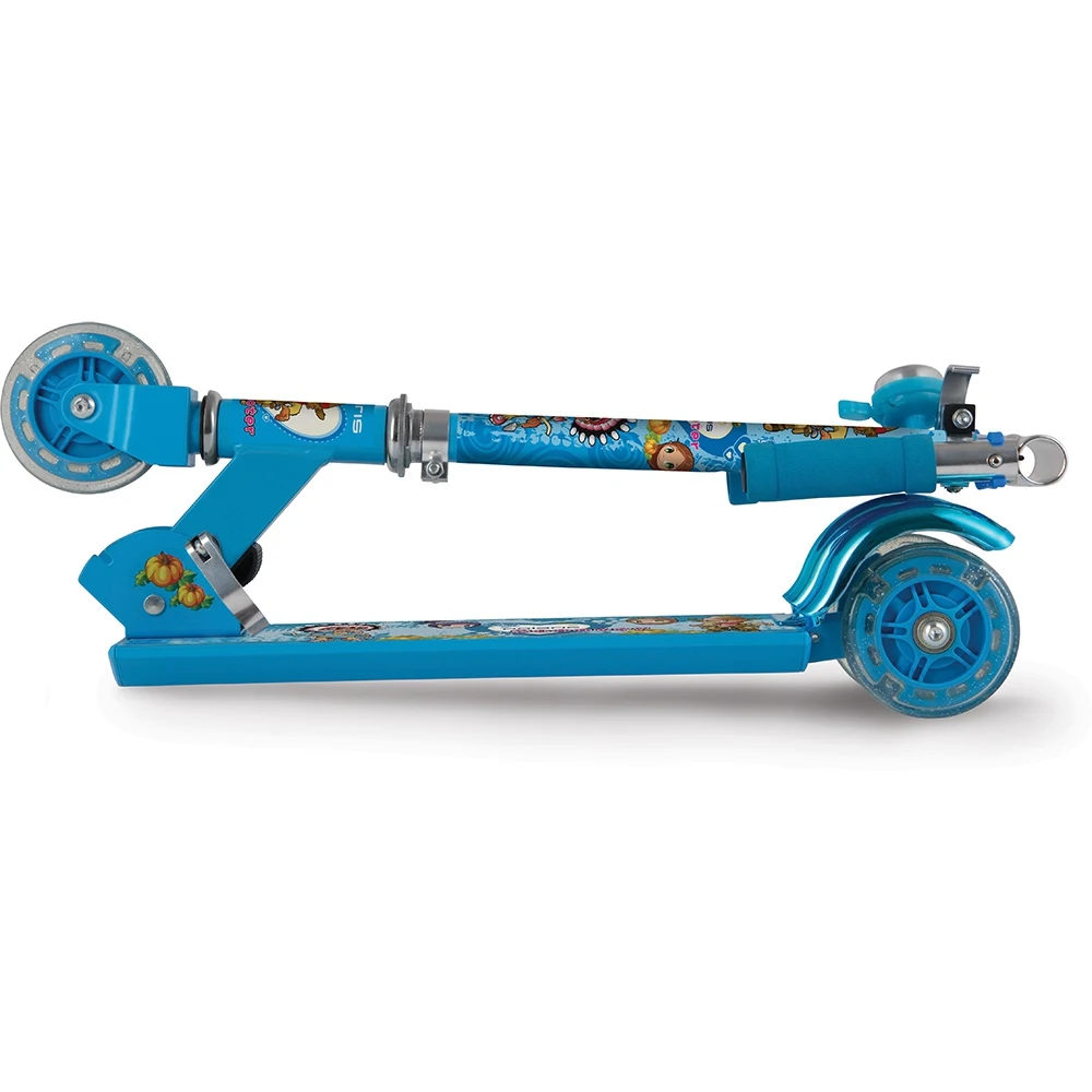 Колеса светятся при езде. Сдвоенные задние колеса. Алюминиевая рама. Складные ручки руля. Звонок. Регулировка руля по высоте. Складная конструкция.