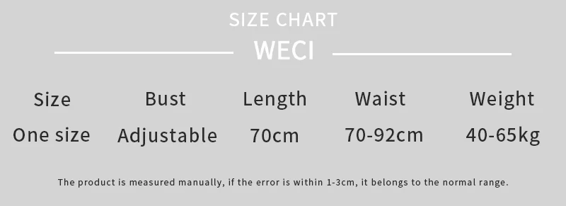 Один размер: обхват груди (регулируется). Длина (70 см). Обхват талии (70-92 см).