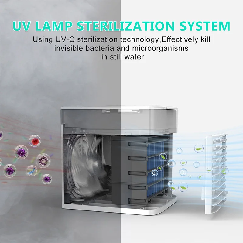 4-in-1 mini cooling air conditioner humidifies, purifies and chills the air, LED night light to create a comfort summer for you,Colorful build-in LED light makes it a great night light for your desk and bedroom