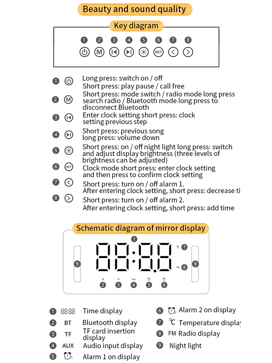 Основные функции: Bluetooth, AUX, карта, u-диск, fm-радио, bluetooth-звонки, дисплей, часы, будильник, атмосферный свет...