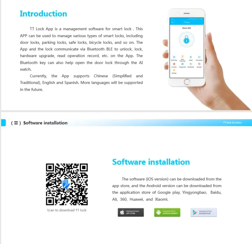Функция: приложение ttlock Tongtong Lock + управляемый пароль + управляемая ic-карта + ключ (может быть реализовано удаленное Унифицированное централизованное управление)