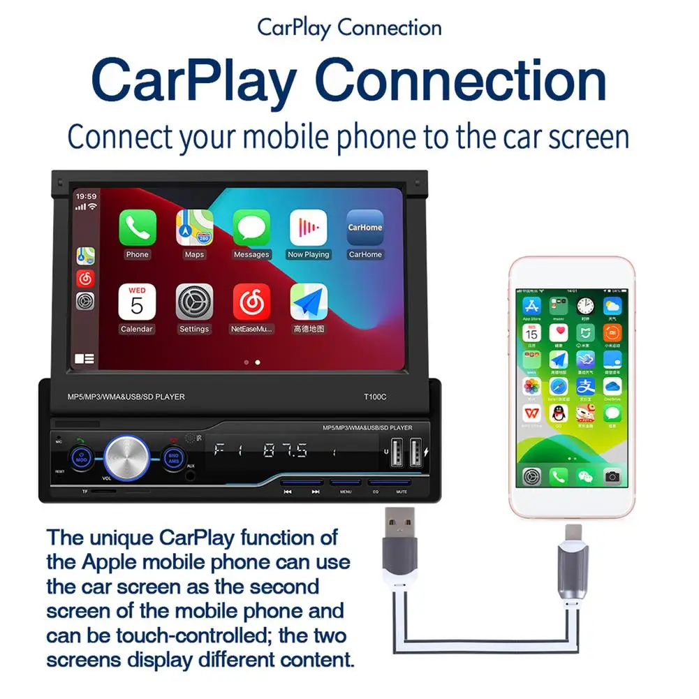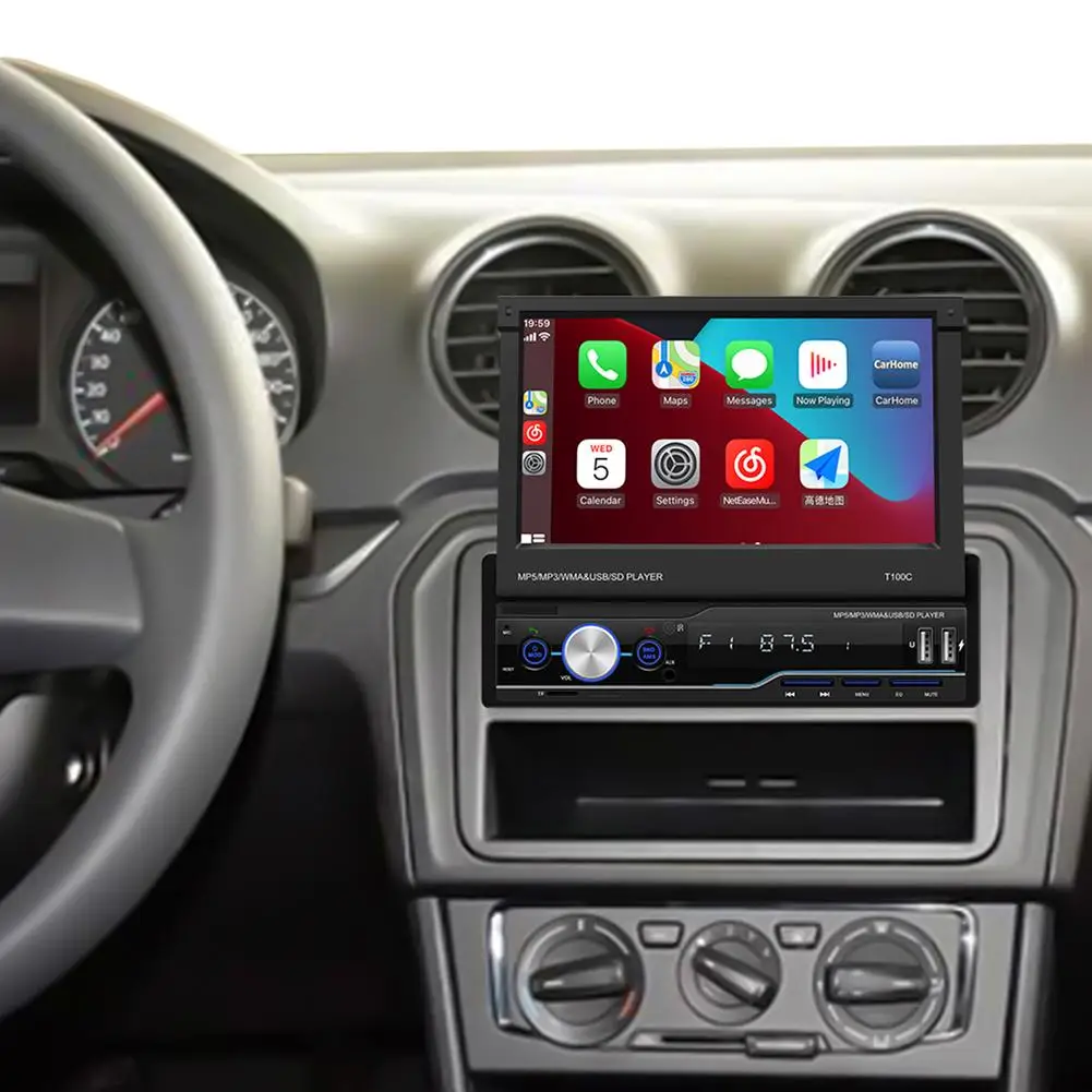 Retractable MP5 Player 1 DIN Apple CarPlay Car Stereo AM/FM Radio Bluetooth GPS Navigation Player Touchscreen Multimedia Player