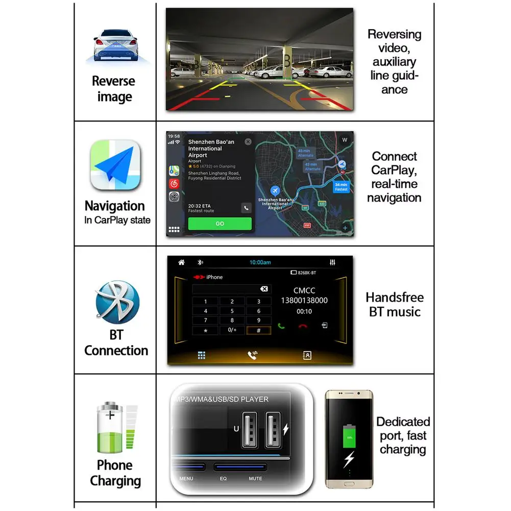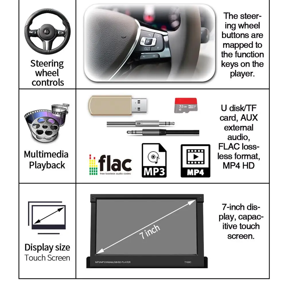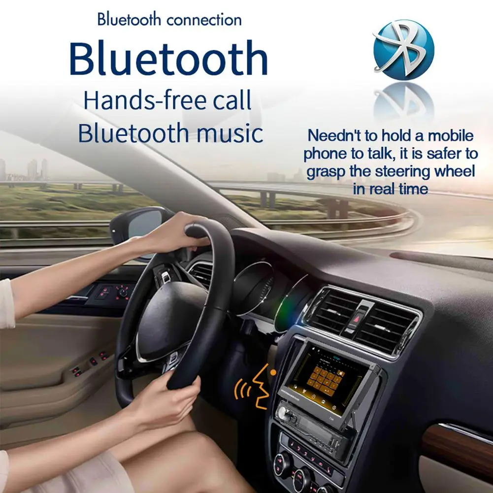 1.Easy Calls: This car device has function for Bluetooth/AUX function (receive/make calls, play music) and AM/FM radio.5.Foldable Screen: 5.7-inch foldable (manual) touch screen display with colorful cool lighting and RCA audio output which can be connected to a subwoofer.
