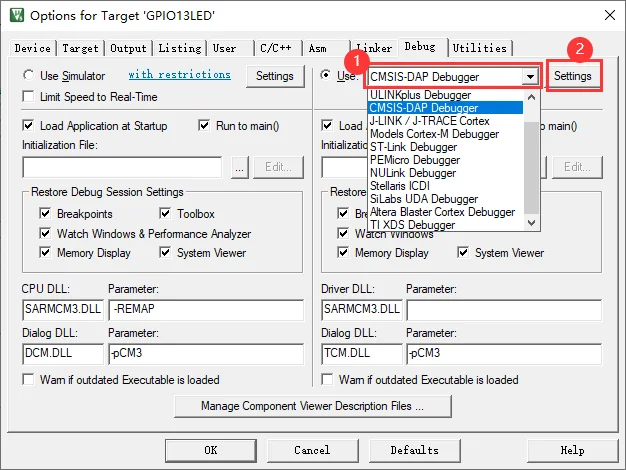 Выберите CMSIS-DAP Debgger в Dubeg атрибут карты по всем параметрам