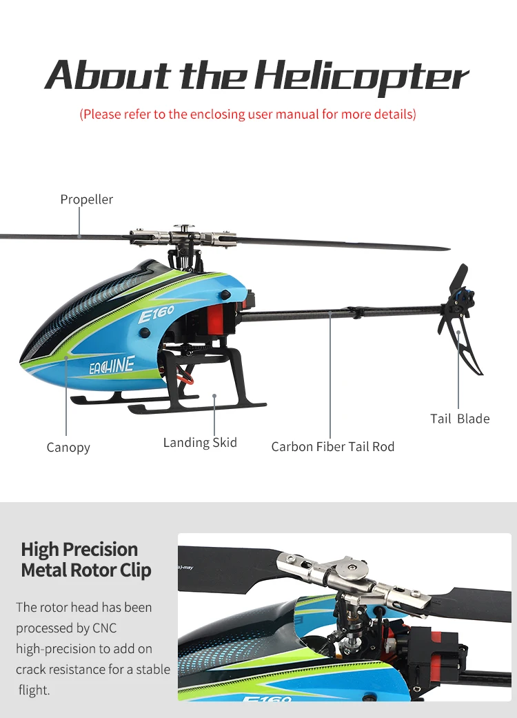 1> Adopt all-metal CNC rotor head without aileron design, using aerodynamic principles to design blades to provide strong power and airframe self-stability.