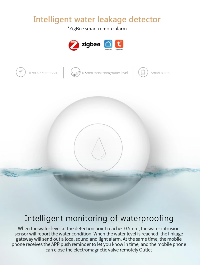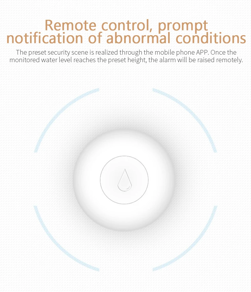 【Обнаружение в реальном времени】Датчик погружения в воду, который может обнаруживать утечку воды в окружающей среде в реальном времени. При обнаружении погружения в воду детектор отправит сигнал тревоги на хост и сообщит информацию на мобильный телефон пользователя. В тех случаях, когда уровень воды на обнаружение точка не достигнет 0,5 мм воды датчик вторжения сообщит о качества воды.