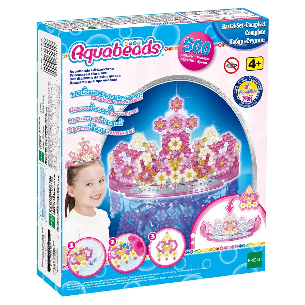 Набор Aquabeads Диадема для принцессы 3D как нельзя лучше подойдет для юных творческих особ. Он включает более 500 бусин. Бусины выкладываются на специальную форму по шаблонам, затем из бутылочки распыляется вода, и бусины соединяются как по волшебству. Готовые украшения из бусин устанавливаются на основу диадемы, которую маленькая принцесса потом сможет носить. При желании всегда можно поменять украшения из бусин, чтобы сделать яркую и красочную диадему, используя новый шаблон, которые уже входят в набор.