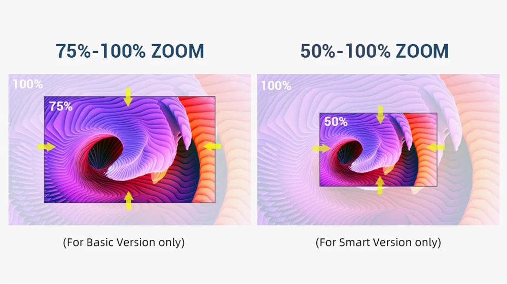 Наш HD проектор является первым проектором с функцией коррекции keystone ± 45 °, чтобы гарантировать, что проецируемое изображение всегда является стандартным прямоугольником. Очень удобно регулировать размер экрана с помощью пульта ДУ, особенно для проектора, подвешенного с потолка. Уменьшение размера проекции с помощью функции X/Y Zoom, в то время как другие могут сделать это только путем изменения расстояния проекции.