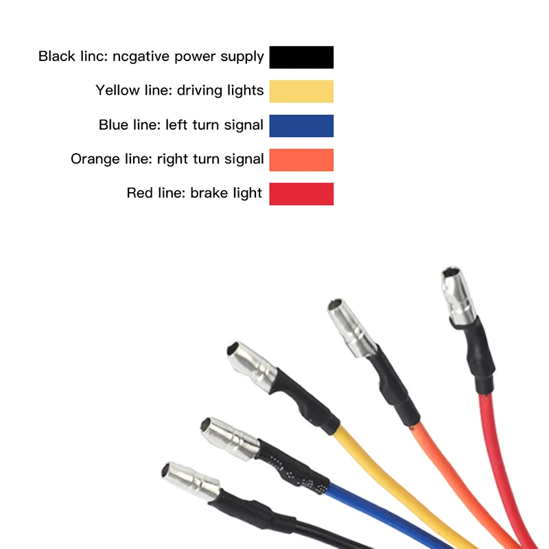 Есть 5 линий: черный-отрицательный; Красный-тормозной светильник; Желтый-дорожный светильник; Синий-левый Поворотный Светильник; Оранжевый-правый поворотный светильник.