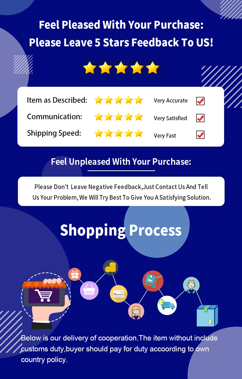 3. Если вы не получили товар через 45 дней, пожалуйста, свяжитесь с нами. Мы приложим все усилия, чтобы решить проблему.