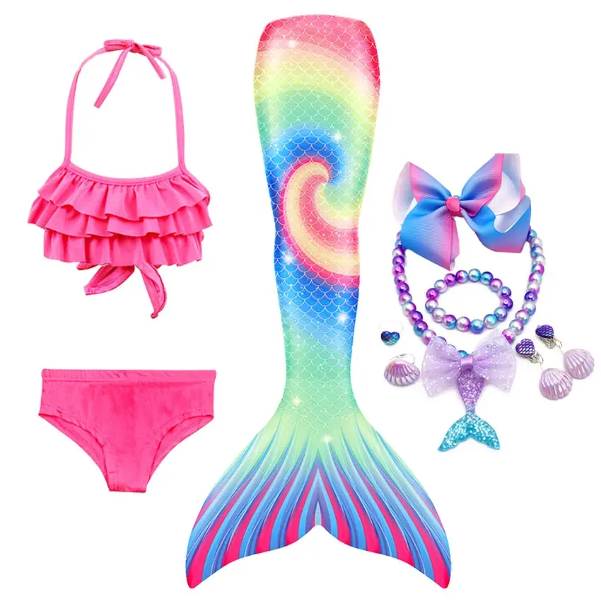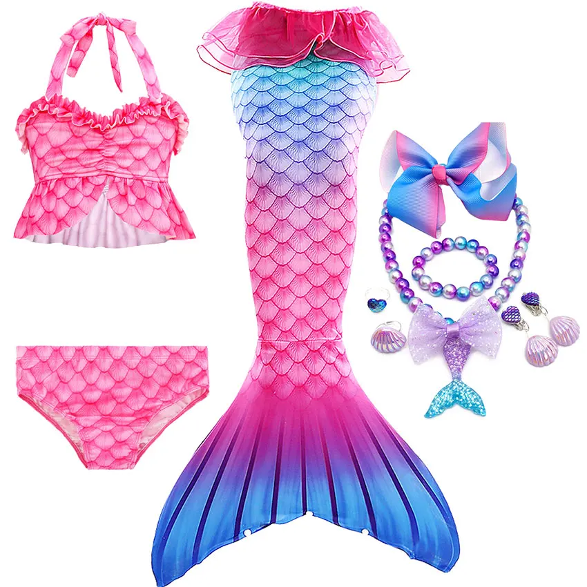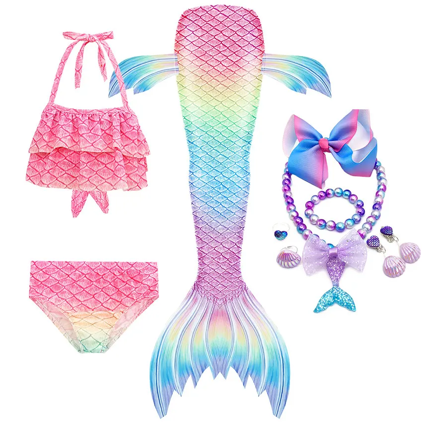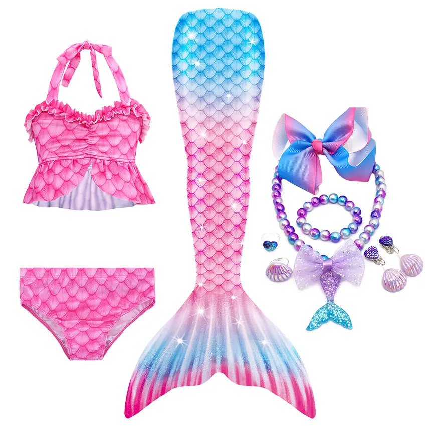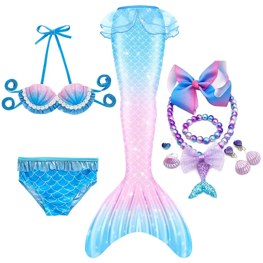 10 шт. в комплекте: 1 * юбка с хвостом русалки + 1 * Топ + 1 * шорты + 1 * ожерелье + 1 * браслет + 2 * кольцо + 2 * клипсы для ушей + 1 * заколка для волос