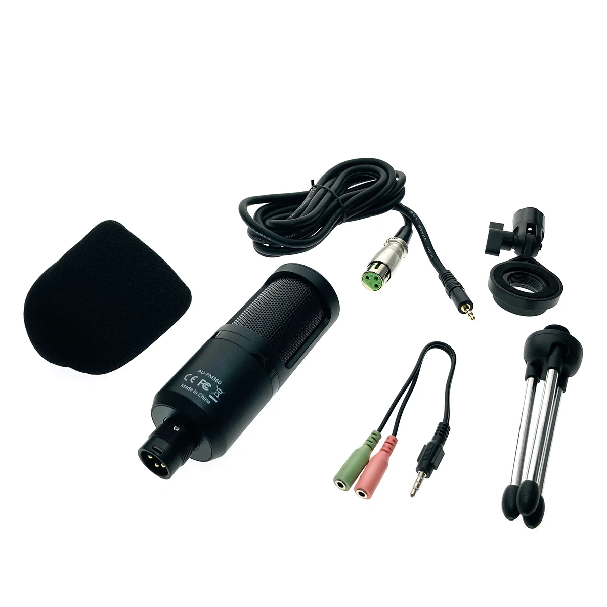 Микрофон, подставка для штатива, защита от ветра, кабель XLR 3pin-jack3.5 4pin, y-адаптер jack 4pin (папа)-2x Jack 3pin (папа)
