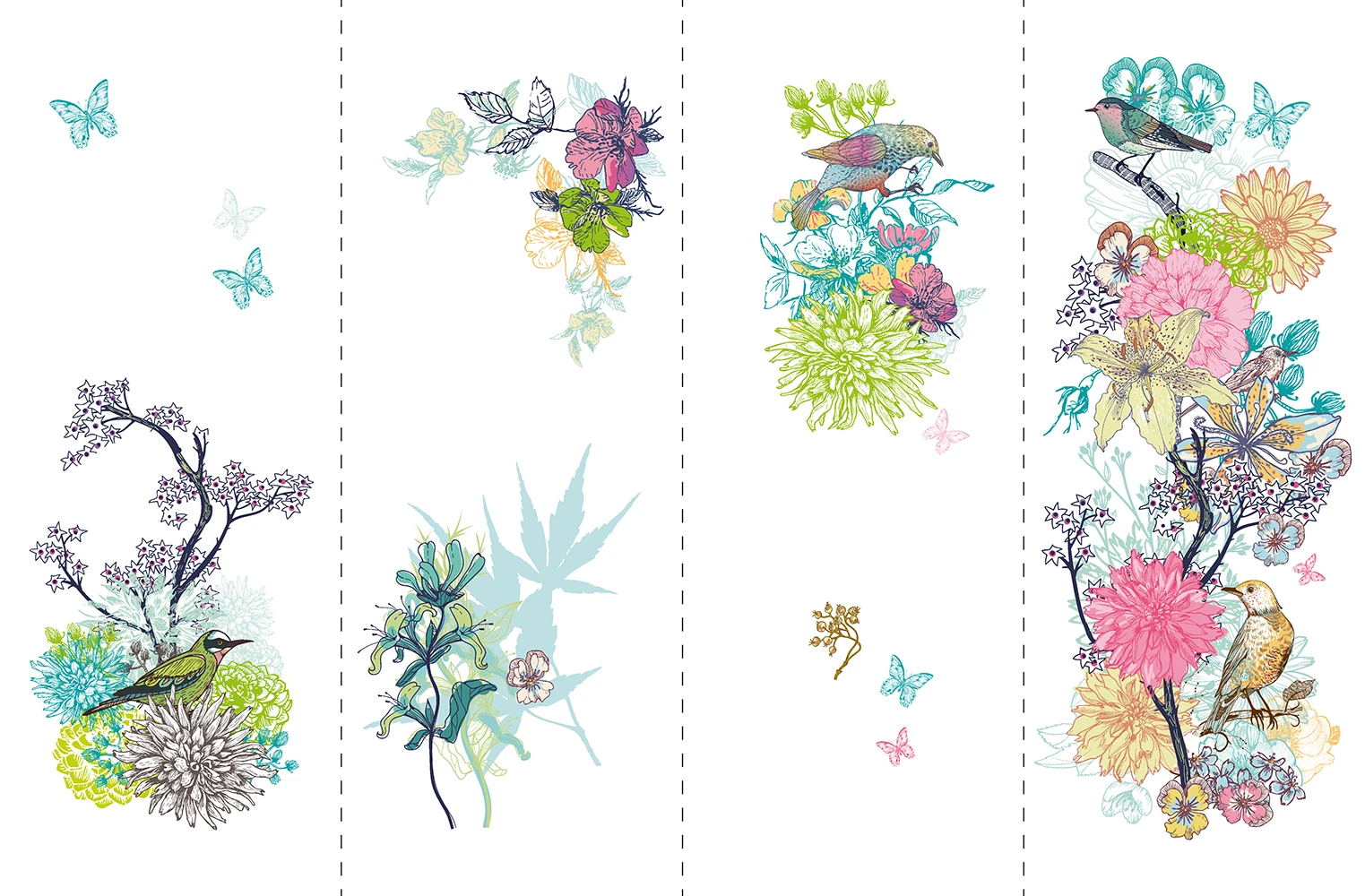 На рулоне указанных выше размеров с небольшими зазорами, позволяющими регулировать длину одной полосы в соответствии с высотой потолка, напечатаны четыре различных, неповторяющихся рисунка, объединенных одной тематикой. Таким образом, получаются уникальные обои-коллаж, очень интересно выглядящие в интерьере любого помещения. Все четыре полосы можно группировать на стене в любом порядке, что обеспечивает вам дополнительную свободу творчества.