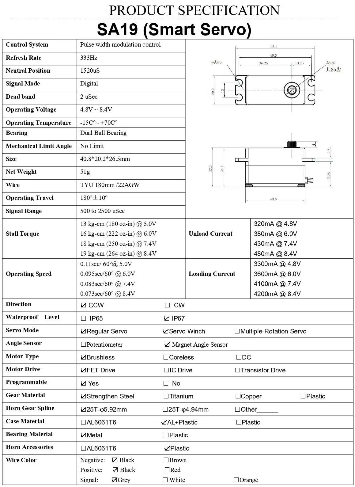 AGFrc 2S низкопрофильный умный сервопривод получил новый член SA19, который позволяет изменить прошивку для регулярного и сервопривод лебедки использования. Быстрая реакция 0.073sec и невероятный крутящий момент 19 кг делают его идеальным сочетанием для тех, кто требует самое лучшее для вашего 1/10 туристического автомобиля или внедорожного применения. Чехол с теплоотводом не только выглядит хорошо, но и обеспечивает более плавную работу. Возьмите один, чтобы произвести впечатление на ваших друзей.