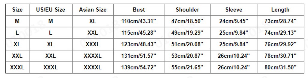 Размеры Размер США/ЕС Азиатский размер Бюст Плечо Рукав Длина М М XL 110 см/43,31'' 47 см/18,50'' 24 см/9,45'' 73 см/28,74'' L L XXL 115 см/45,28'' 49 см/19,29'' 25 см/9,84'' 74 см/29,13'' XL XL XХХL 123 см/48,43'' 51 см/20,08'' 25 см/9,84'' 76 см/29,92'' XXL XXL XXXXL 131 см/51,57'' 53 см/20,87'' 26 см/10,24'' 78 см/30,71'' XХХL XХХL XXXXL 139 см/54,72'' 55 см/21,65'' 26 см/10,24'' 80 см/31,50''