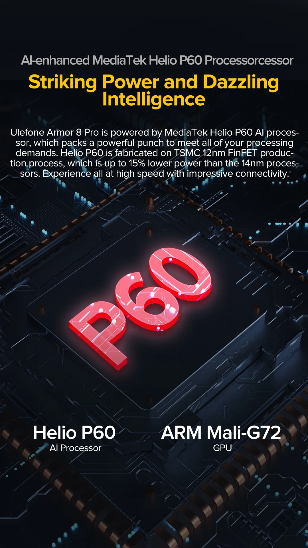 Ulefone Armor 8 Pro питается от процессора MediaTek Helio P60 AI, который оснащен мощным ударом, чтобы удовлетворить все ваши требования к обработке. Helio P60 изготовлен на TSMC 12 нм FinFET производственном процессе, который на 15% ниже мощности, чем 14нм процессоры. Опыт всех на высокой скорости с впечатляющим подключением.