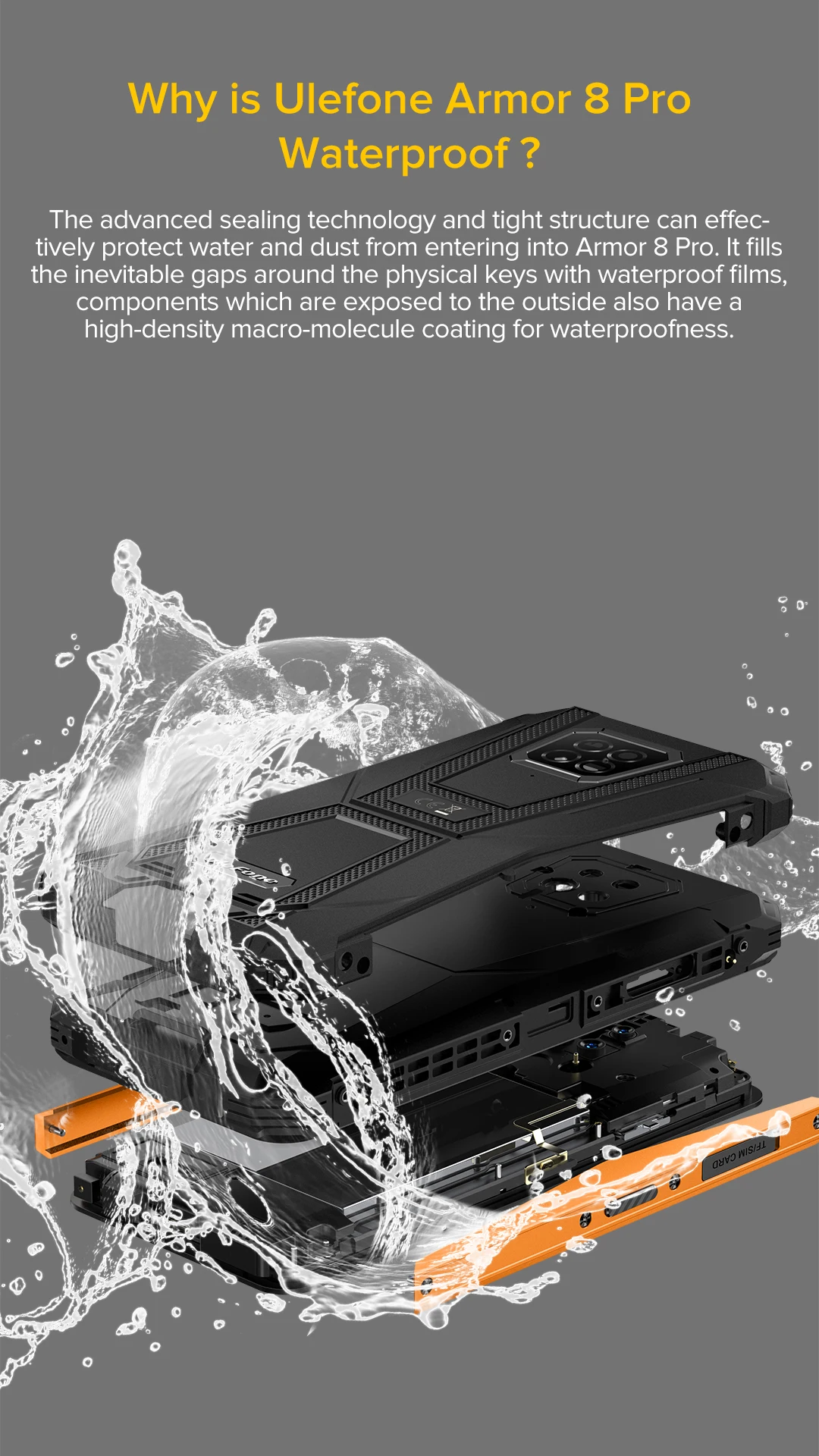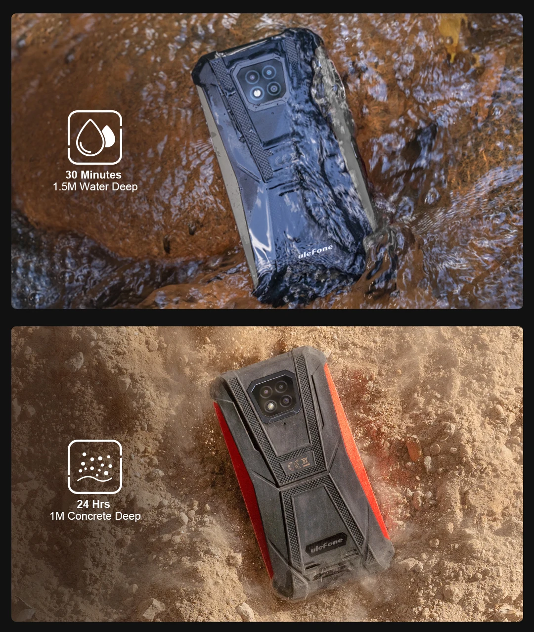 Ulefone прочный телефон устойчив к воздействию воды и пыли. Он был протестирован с номиналом IP68 в условиях под контролем лаборатории в соответствии со стандартом IEC 60529 (максимальная глубина 1,5 метров до 30 минут). Защита от брызг воды и пыли не является постоянными условиями, и сопротивление может уменьшиться в результате нормального износа. Не пытайтесь зарядить влажный телефон; Инструкции по очистке и сушке см. В руководстве пользователя. Повреждение жидкости не покрывается гарантией.