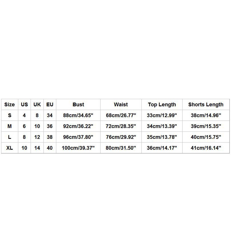Размеры США Великобритания ЕС Бюст Талия Длина верха Длина шорт S 4. 8 34 88 см/34,65'' 68 см/26,77'' 33 см/12,99'' 38 см/14,96" М 6 10 36 92 см/36,22'' 72 см/28,35 дюйма 34 см/13,39'' 39 см/15,35" L 8 12 38 96 см/37,80'' 76 см/29,92'' 35 см/13,78'' 40 см/15,75" XL 10 14 40 100 см/39,37'' 80 см/31,50" 36 см/14,17'' 41 см/16,14"