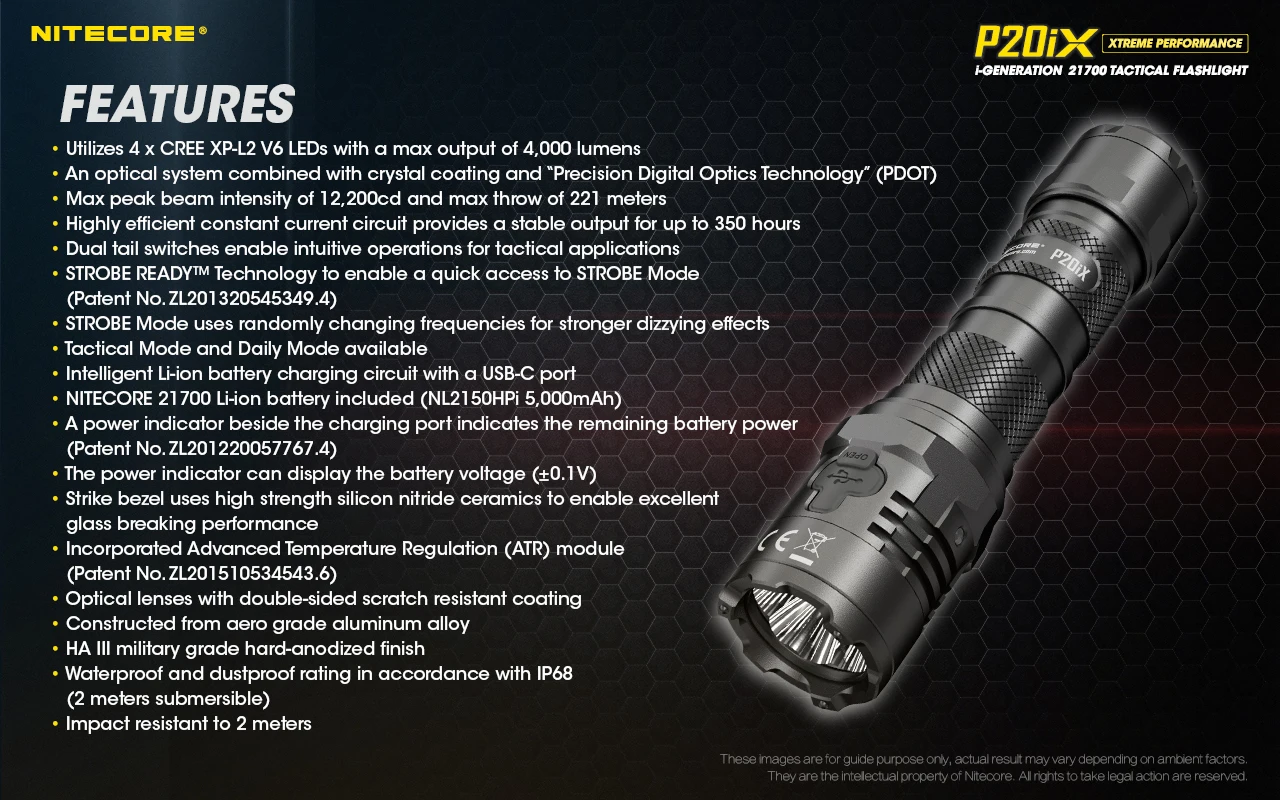 Посылка включает в себя: фонарик P20iX * 1, аккумулятор NL2150HPi * 1, журнал батарей CR123 * 1, Тактический кобура NTH20 * 1 ,USB-C кабель для зарядки * 1, ремешок * 1, зажим * 1, запасное уплотнительное кольцо * 1