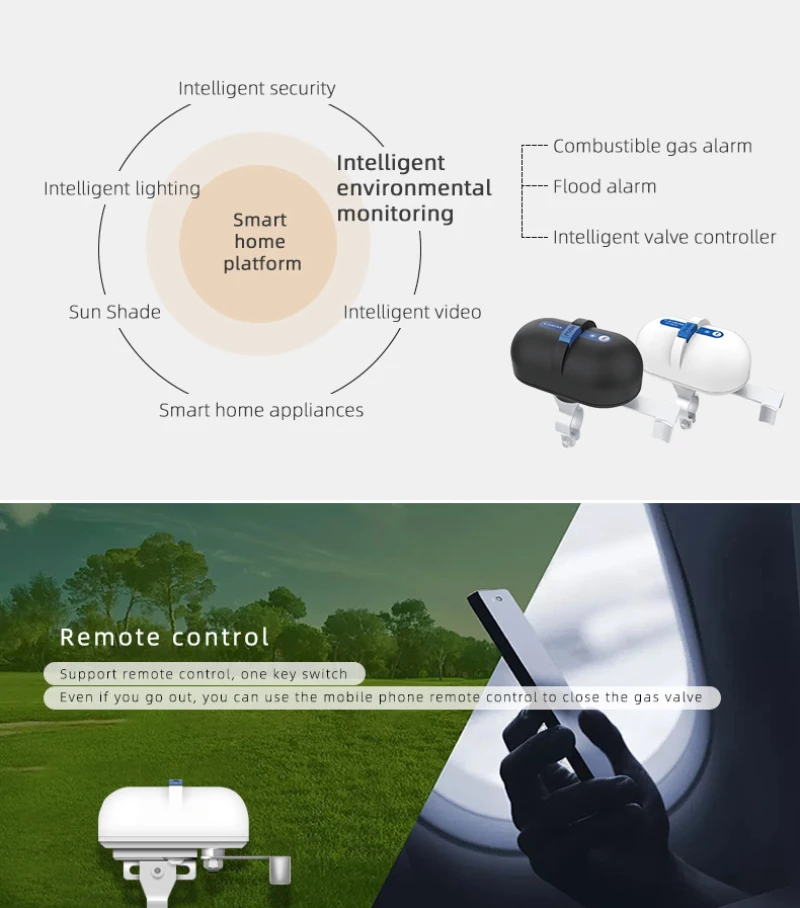 【Интеллектуальный уровень 】 он может быть подключен к различным горючим газовым сигналам. При обнаружении утечки газа сигнализация о горючем газе отправит команду закрытия при тревоге, и интеллектуальный контроллер газового клапана выполнит команду, чтобы закрыть шаровой клапан для защиты безопасности дома. (Используется для водяного клапана, газового клапана и т. д.)