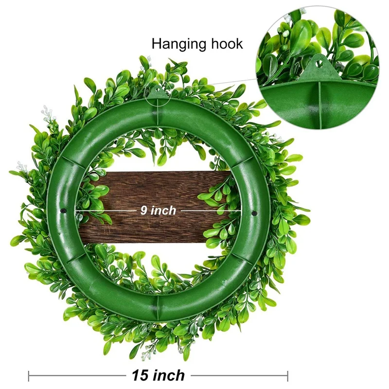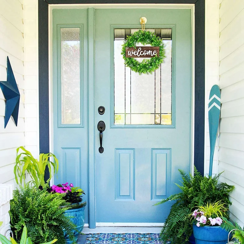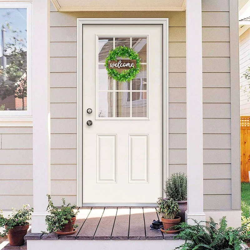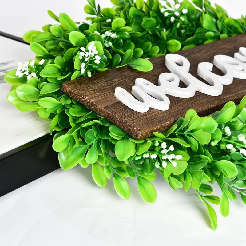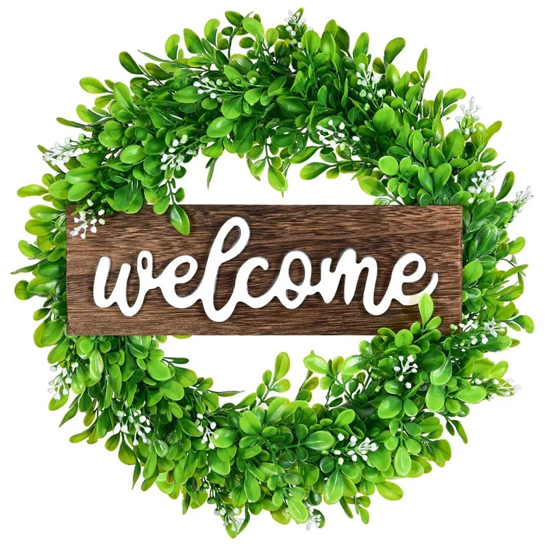 [Декоративный венок] -- искусственный зеленый венок окружен искусственными листьями boxwood, имеет 12 дюймов * 4 дюйма деревянный знак Добро пожаловать в середине венка, простой элегантный и яркий цвет, создает естественную атмосферу для дома круглый год.