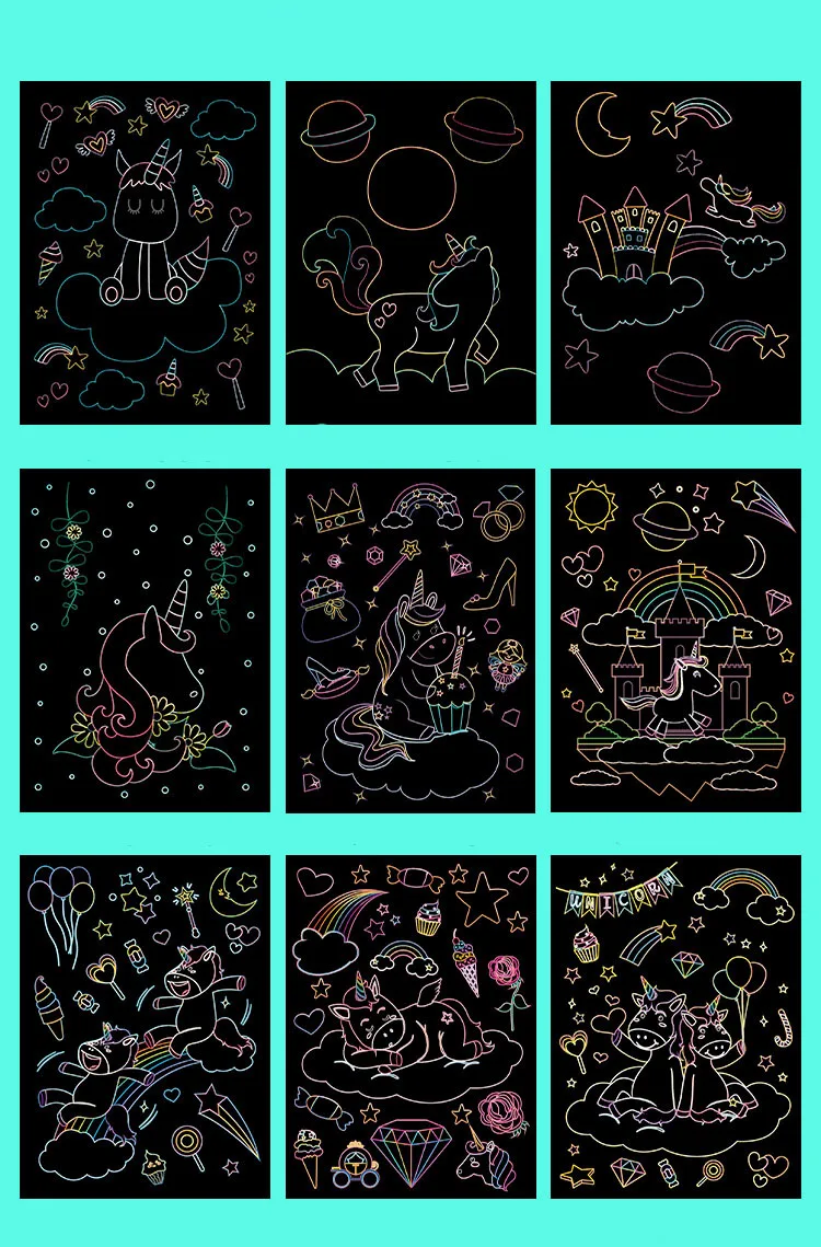 9 шт. Волшебная красочная Радужная скретч бумага для живописи набор карт мультяшный Единорог динозавр доска для рисования дети Сделай Сам обучающая игрушка