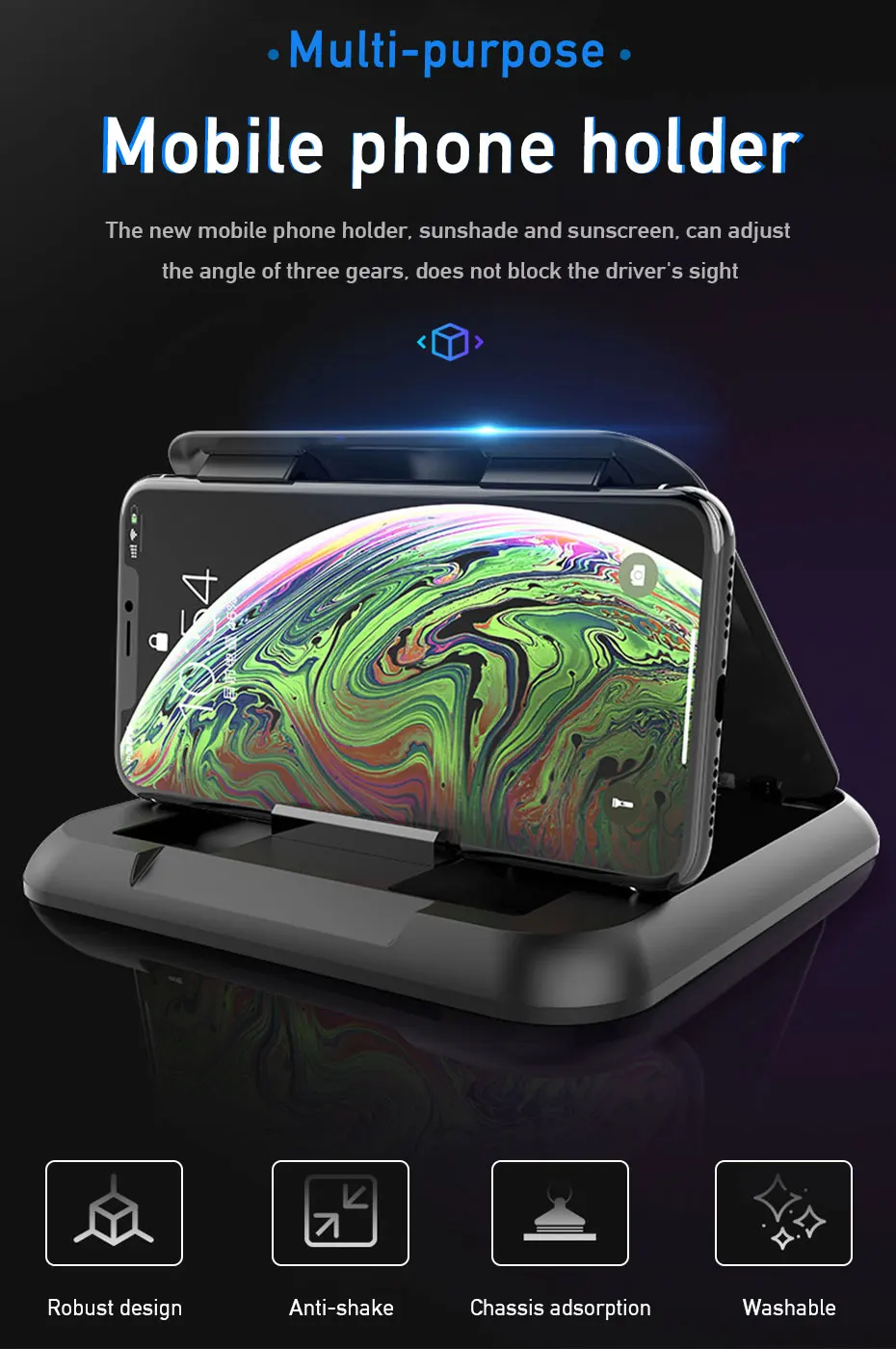 2. [устойчивость и нескользящая] Трехточечная арматура на приборной панели: большое Силиконовое шасси окружено вязким силиконом и присосками. Даже когда автомобиль резко поворачивается или останавливается, кронштейн может быть прочно закреплен на приборной панели или ускорен.