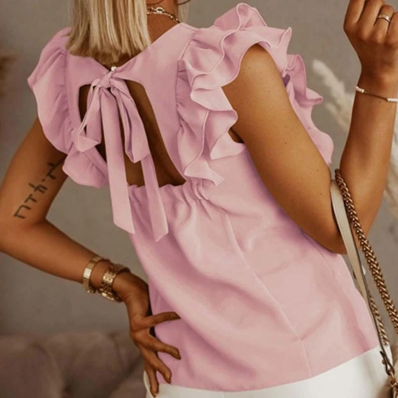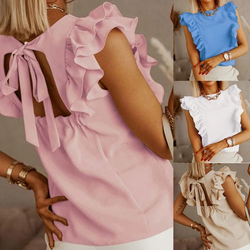 Женские летние гофрированные футболки с коротким рукавом, сексуальный пуловер с открытой спиной и бантом на завязках, топы, однотонные повседневные свободные S-3XL