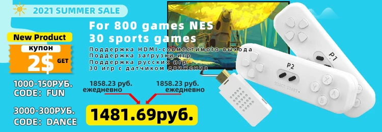 Последняя игровая консоль с датчиком движения видео, с 30 встроенными интерактивными соматосенсорными играми, вы можете играть в игры с двумя беспроводными геймпадами дистанционного управления, такими как резка арбуза, бег, yogaи т. д. В нашей игровой консоли также встроены 800 игр NES, и российские покупатели также могут выбрать более 500 российских игр.