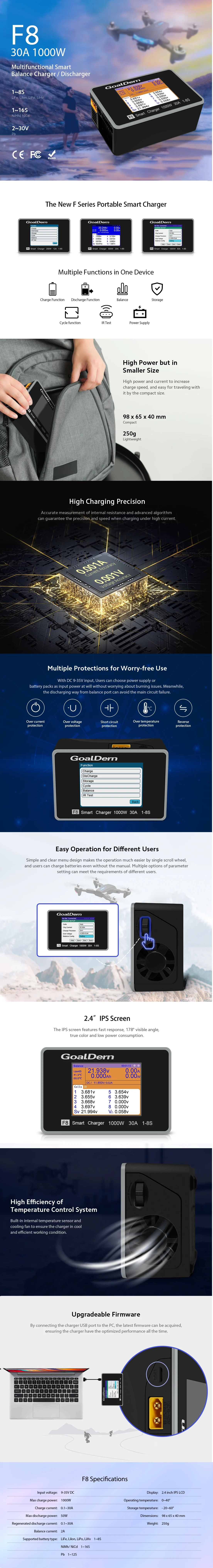 GoalDern F8 1000 Вт 30A умное зарядное устройство для 8S LiPo LiHv NiMh NiCd Pb батарея